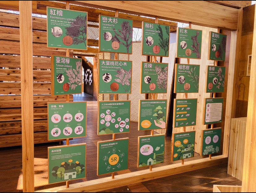 東勢林管處表示,這次將館內空間重新規劃設計了10種不同的展示主題,以台灣杉、台灣櫸、樟木、相思木等所構成木材質的樣板牆,獨特的拉門設計,讓民眾可以看到不同材種所呈現的木紋,更可以近距離觸摸感受不同材種的質地;以翻翻板趣味設計的「知識牆」,了解什麼是國產材、台灣木材標章及碳匯等知識,透過小木屋造型的森活小知識,更深切知道使用國產材的優點,另外還有竹的材質牆、木材取材方法、國產材廠商介紹等,帶領民眾更深一層的認識台灣國產木材。