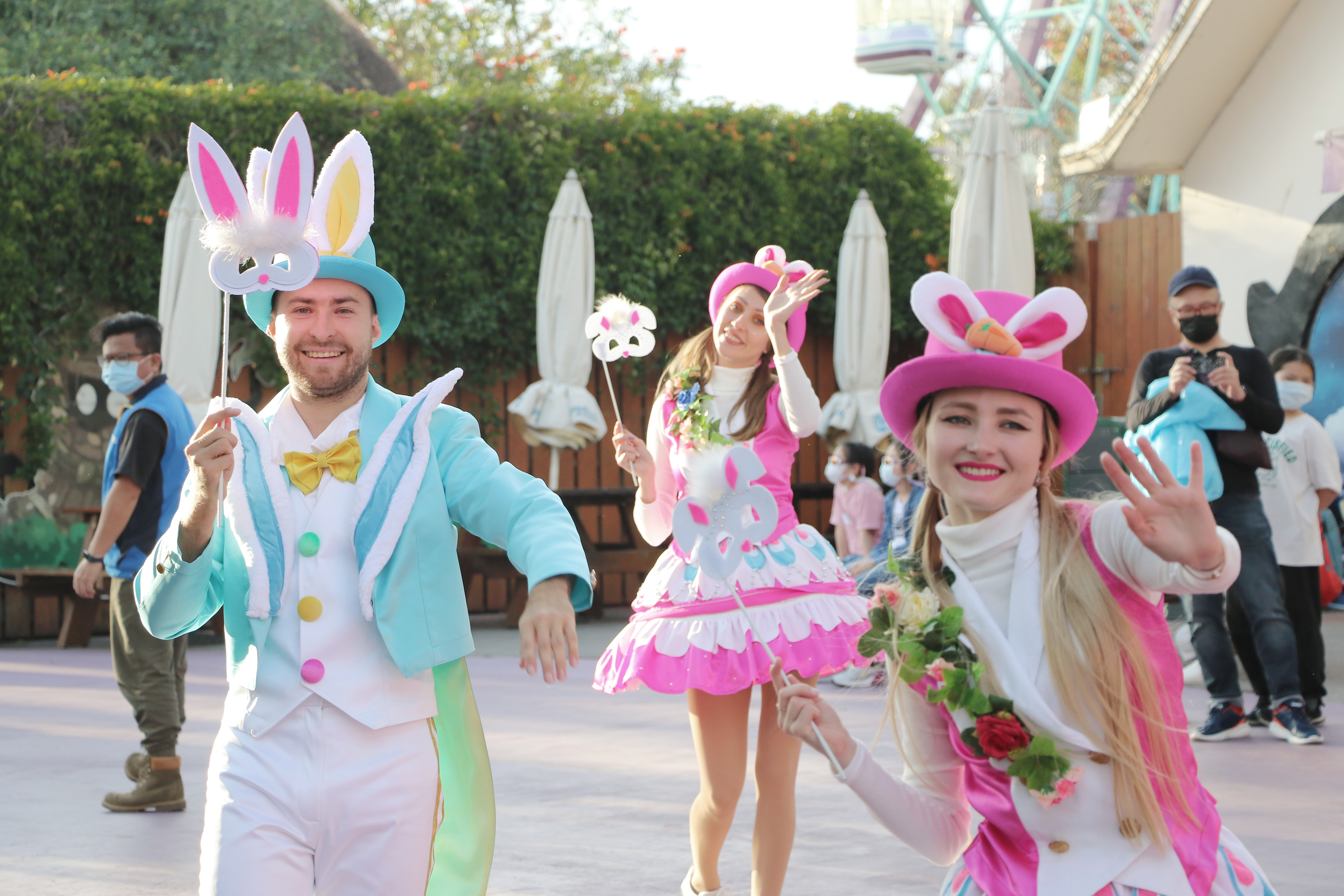 住飯店玩樂園還能賞兔! 今年的探索世界樂園遊行以生肖年主角兔為主軸,推出「DANCE 兔GETHER 歡樂大遊行」,受到親子族群的廣大迴響,由身穿西裝、手持兔子面具的萌兔舞者與可愛的紅蘿蔔精靈,帶來一場歡樂派對,就連可愛的POPA家族也換上兔年造型,絕對是親子出遊不容錯過的精采表演。
