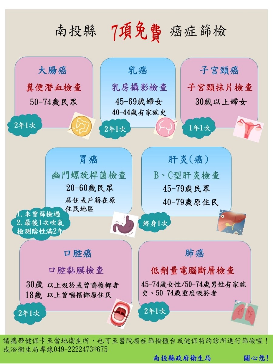 南投縣積極推廣健康預防保健,提供7項免費的癌症篩檢服務(乳癌、子宮頸癌、大腸癌、口腔癌、肺癌、胃癌及BC型肝炎)112/02/10(星期五)下午14:00-18:00於竹山衛生所(南投縣竹山鎮公所路126號)提供完善的巡迴篩檢,服務內容包括:身高、體重、血壓測量、血液、尿液、7項癌症篩檢(乳癌、子宮頸癌、大腸癌、口腔癌、肺癌、胃癌及BC型肝炎)、衛教宣導、健康諮詢及轉介…等多項服務。