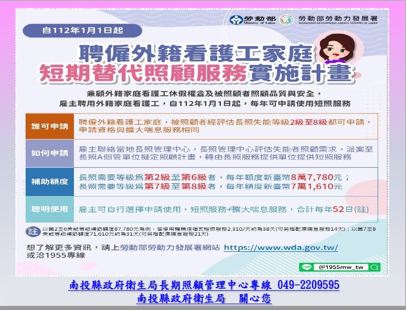 家中有外籍看護工的鄉親,外籍看護請假怎麼辦? 「短期替代照護服務」上路了!勞動部為強化外籍家庭看護工休假權益,與衛生福利部合作推動「聘僱外籍看護工家庭短期替代照顧服務」(下稱短照服務)。自112年1月1日起,經地方照顧管理中心評估符合長照需要等級為第2級(含)至第8級並聘有外籍家庭看護工者,於目前喘息服務外再提供短期照顧服務,每一年累計可達52日。