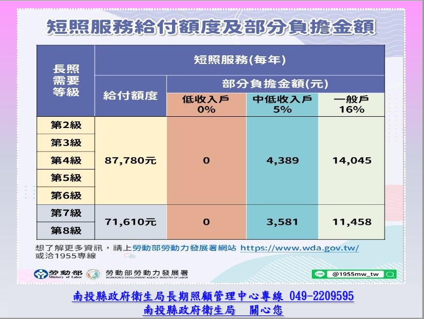 ※ 補助項目及基準:長照需要等級第2級至第6級補助額度8萬7,780元為例,若使用機構住宿式短照服務2,310元/天,約可補助38天;長照需要等級第7級至第8級補助額度7萬1,610元,使用機構住宿式短照服務2,310元/天,約可補助31天。長照需要等級第2級至第8級之短照服務加擴大喘息服務額度合計可達52日/年。