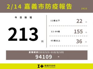 中央流行疫情指揮中心今(2/14)日公布嘉義市新增213例確診個案,包含12歲以下22例,12-64歲155例,65歲以上36例。111/1/1截至112/2/13嘉義市累計確診嚴重特殊傳染性肺炎本土病例數為94,109人。