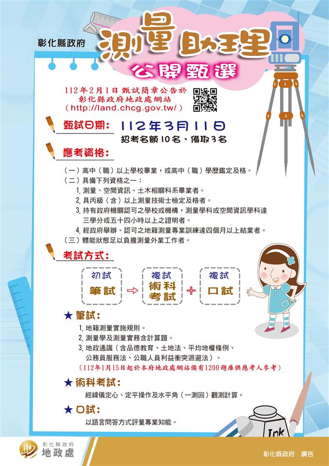 彰化縣政府為徵求優秀測量人才,訂於112年3月11日於彰化縣立彰泰國民中學,舉辦「112年度彰化縣政府測量助理甄試」( https://land.chcg.gov.tw/)),報名至2月21日截止(郵戳為憑)歡迎有志人士踴躍報考。