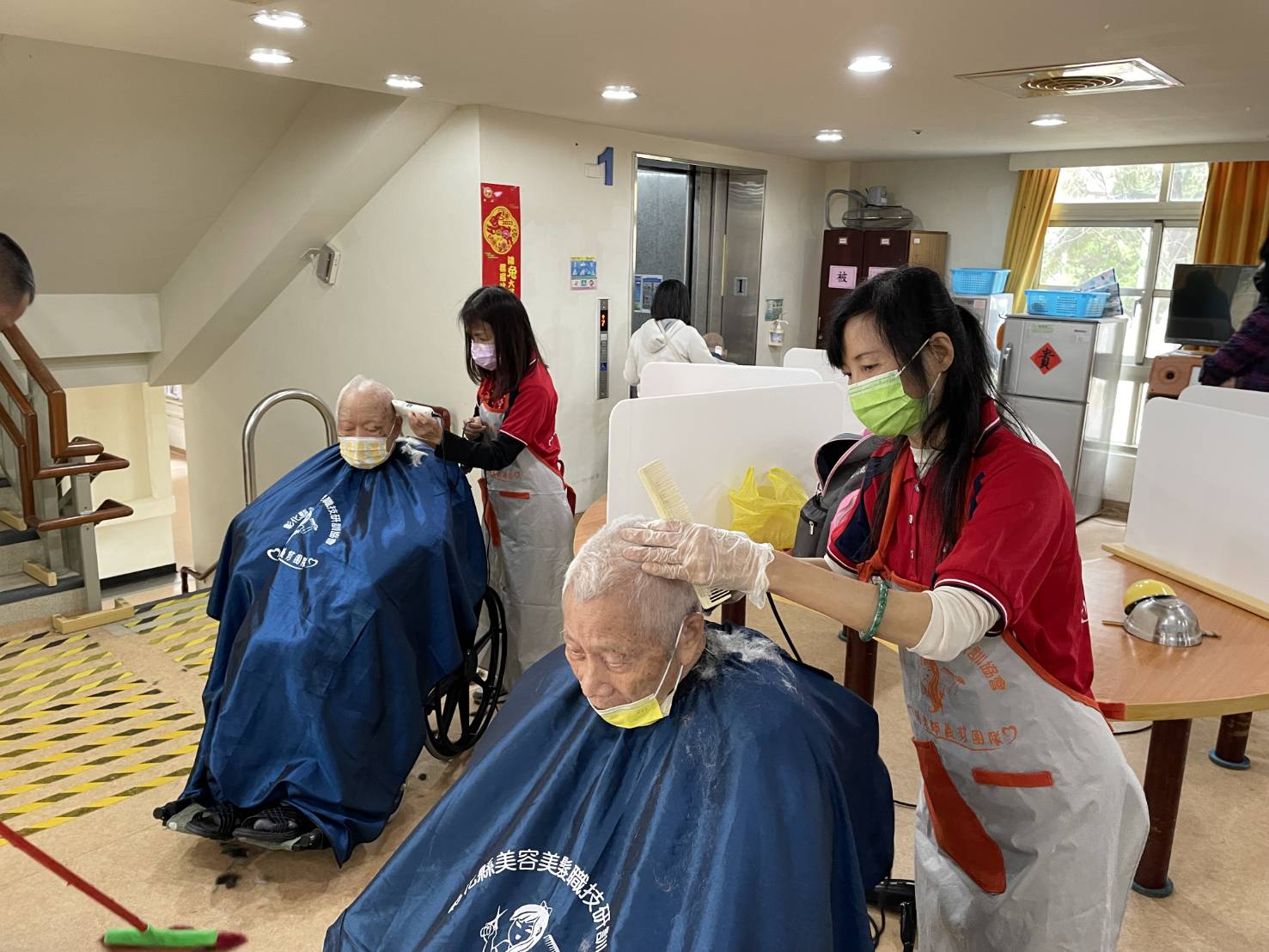 當日13位穿著紅色制服的團隊,攜帶各式專業理髮用具,分別到養護、失智及安養房舍內,在輕鬆融洽的氣氛下,美髮設計師們邊剪髮邊話家常,一會兒在她們巧手天成的修剪下,每位長輩都成為型男美女,容光煥發。