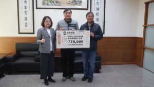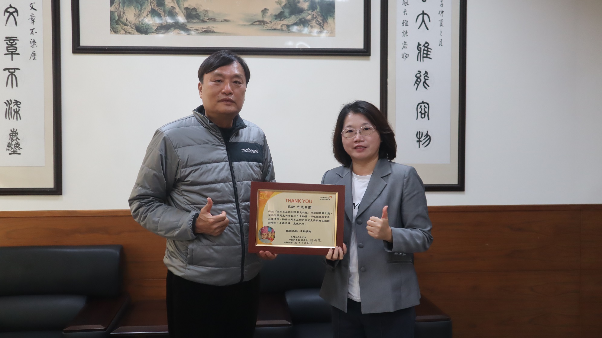 台灣世界展望會胡婉雯區處長回贈感謝狀給宏恩集團董事長洪哲盛先生