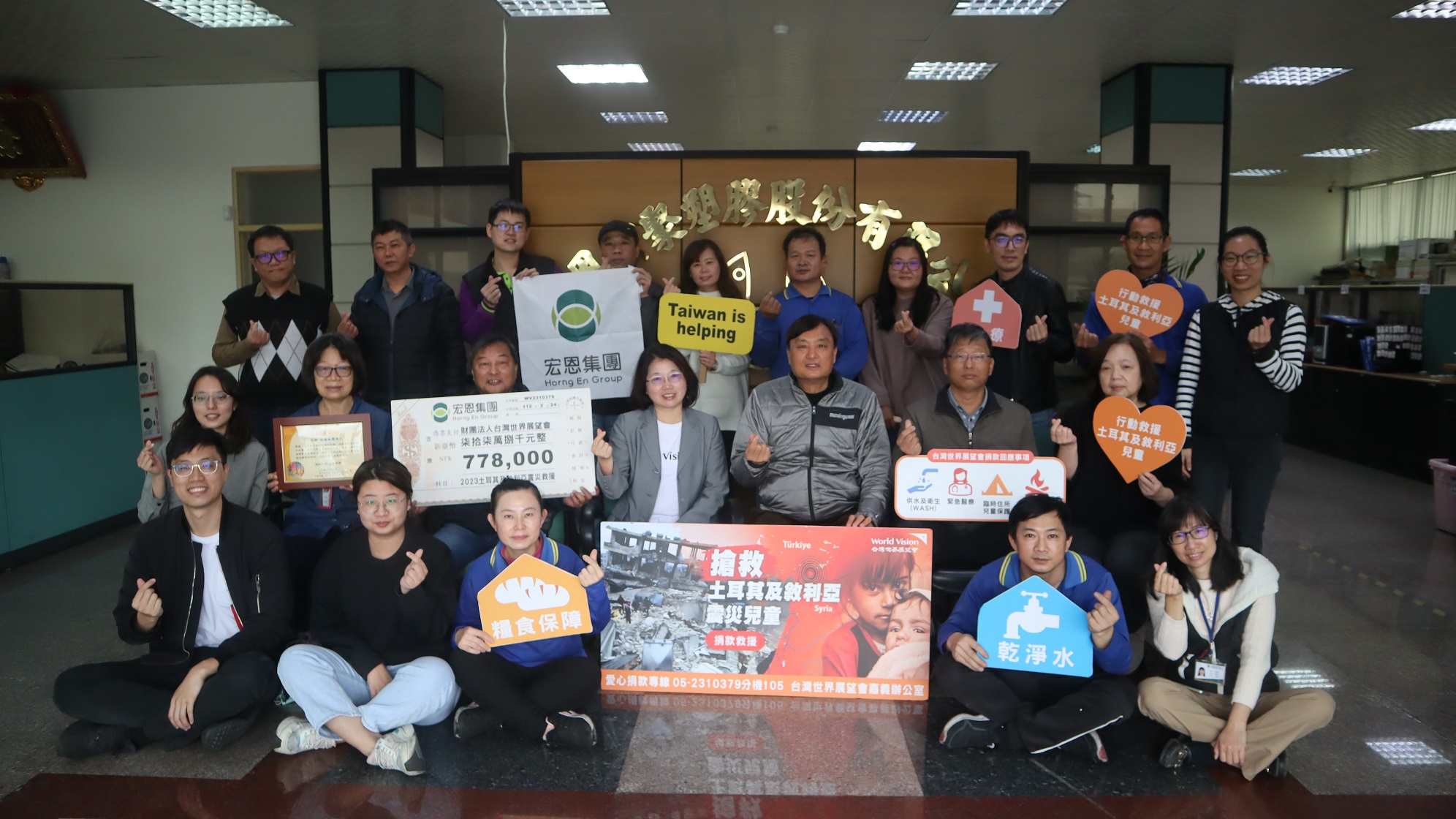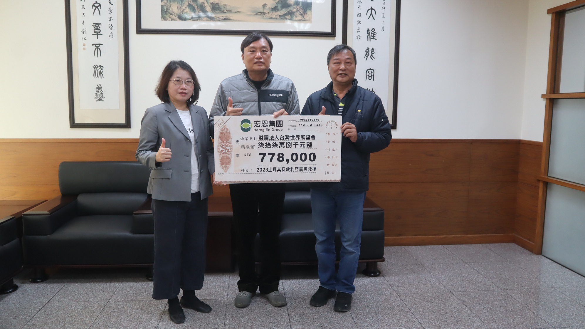 來自彰化芳苑的愛心企業宏恩集團第一時間接收到地震相關資訊後,宏恩集團在第一時間立即回應土敘震災救援需求捐款40萬元,隨後也邀請了集團內部的員工一同響應捐款378,000元,在這樣的愛心匯集中,宏恩集團暨員工捐款總計778,000元,回應土耳其及敘利亞受災家庭的急迫需要,以行動支持及關懷。