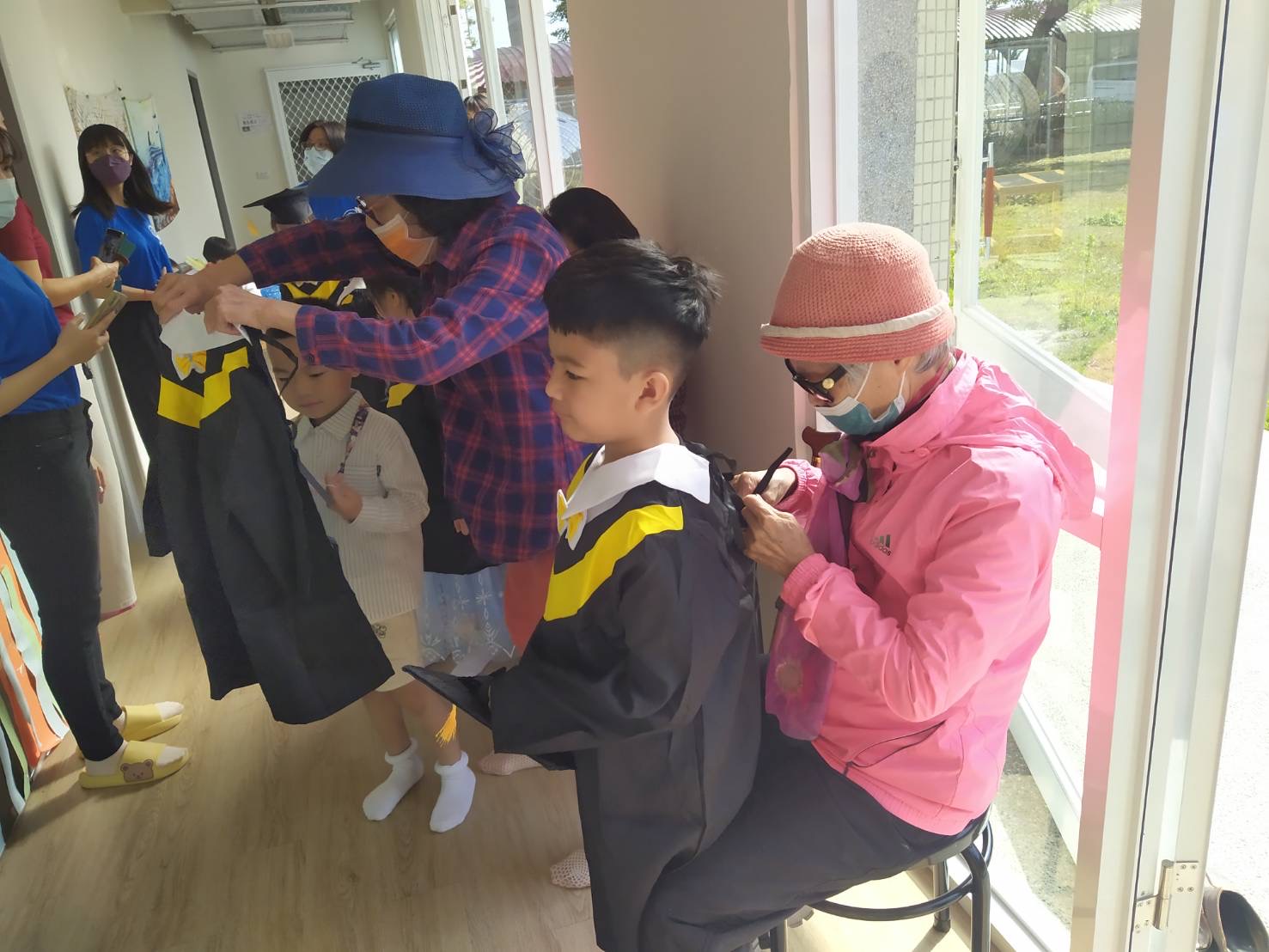 馬蘭榮家附設非營利幼兒園第一屆畢業活動正式開跑了,在今月8日,首先登場的是拍攝小小畢業生畢業照,最特別的是由榮家9位志工奶奶,一起為小朋友們整理容裝服儀,小朋友們個個精神奕奕,只見平日活力無限的小寶貝們在此時,每個竟乖乖的讓奶奶們整理服儀,親切的住民奶奶個個發揮巧手,將小小畢業生們整理的一絲不苟,而當套上畢業裝時,更是無限的可愛唷,而掌鏡拍照的,更是馬蘭榮家的榮民林茂生爺爺,他平時愛好攝影,這時當起專業的攝影師,將小小畢業生照的天真活潑,可愛靈動的表情,留下美好回憶。