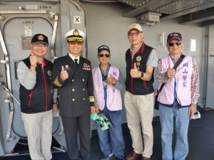榮民長輩們看到軍艦很雀躍!海軍官兵親切地接待與協助年長的長輩們,導覽介紹各式陳列的展覽文物,睹物憶往,聽得津津有味。期間,海軍艦隊指揮部主任馮將軍,便前來向榮民長輩致意,並獲熱烈掌聲;長輩們除登艦參觀外,海軍官校鼓號樂隊、海軍樂儀隊、陸戰莒拳隊等帶來精彩的動態展演,向國人呈現堅實的戰力。