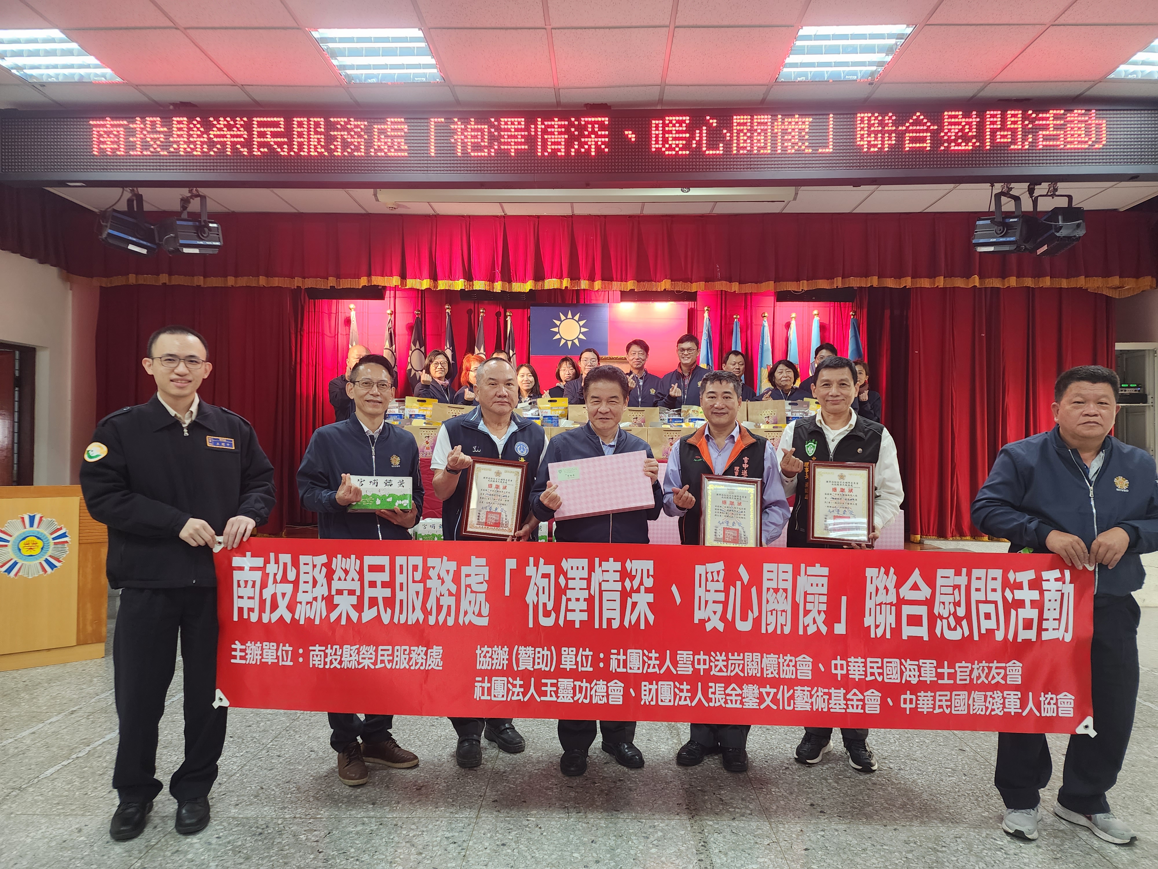 南投縣榮民服務處為關懷轄區內義務役因公傷殘及參與823戰役等清寒退除役官兵,特別邀請社團法人雪中送炭關懷協會、中華民國傷殘軍人協會、中華民國海軍士官校友會、社團法人玉靈功德會及財團法人張金鑾文化藝術基金會等聯合進行訪慰活動,由參與的軍人社團及慈善團體準備愛心物資及慰問金,一同送愛到因公受傷、失能及弱勢之榮民家中,展現袍澤情誼,傳遞社會關懷。