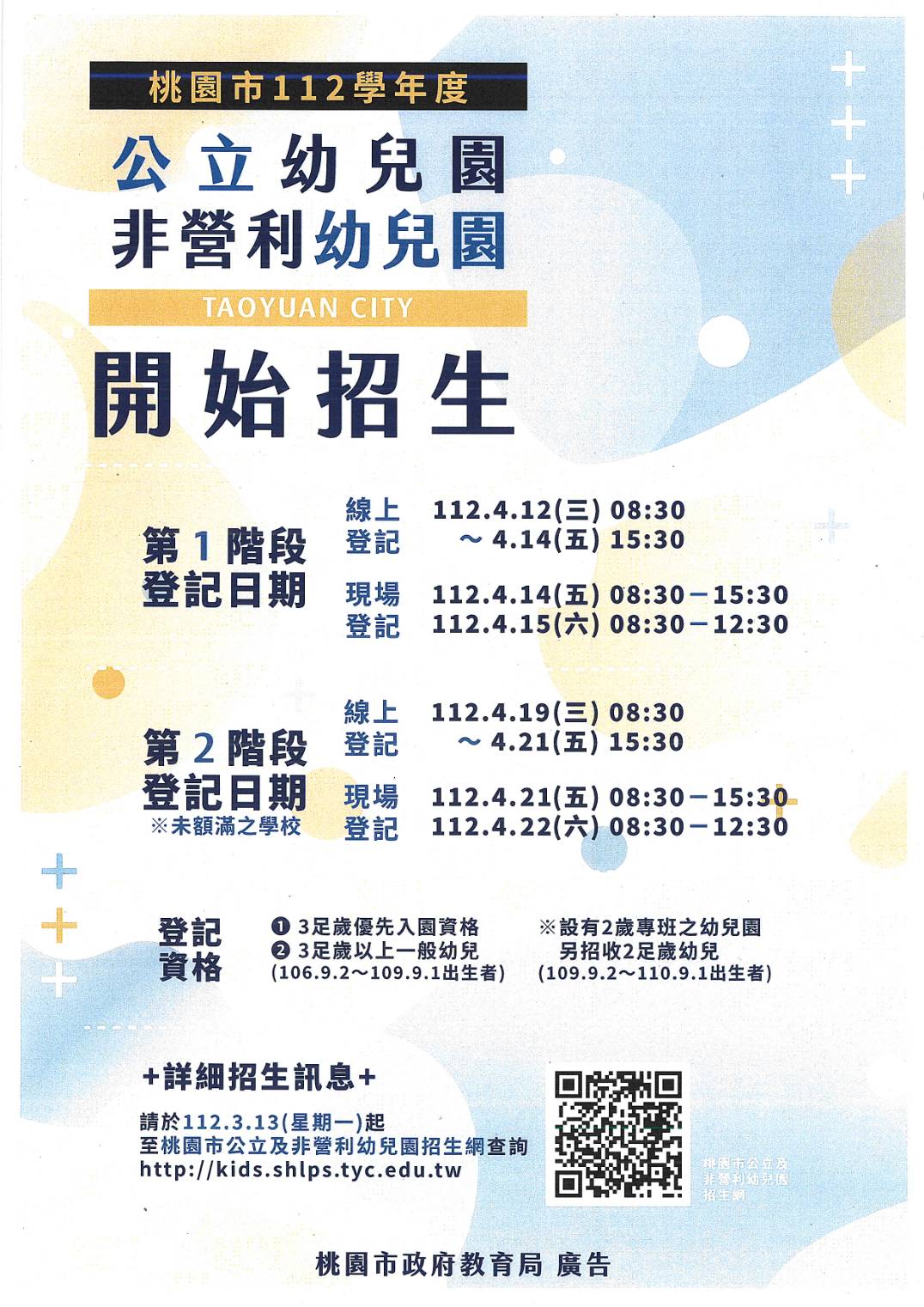 桃園市桃園公立、非營利幼兒園開始招生囉! 榕嫻3 年 ago01 mins 記者蔡念真桃園報導 桃園市教育局 (()112年學年度(]) 公立幼兒園 非營利幼兒園 開始招生囉! 年輕爸爸媽媽請留意招生登記日期。 文章導覽 Previous: 2023國際自由車環台賽 桃園站登場Next: 桃園台電變電箱爆炸 4千戶停電受影響 發佈留言 取消回覆發佈留言必須填寫的電子郵件地址不會公開。 必填欄位標示為 *留言 * 顯示名稱 * 電子郵件地址 * 個人網站網址 在瀏覽器中儲存顯示名稱、電子郵件地址及個人網站網址,以供下次發佈留言時使用。