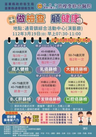 苗栗縣政府衛生局、通霄鎮各相關單位、發展協會、通霄婦女會及婦女新知協會等,結合苑裡李綜合醫院共同辦理健康篩檢活動,於112年3月19日7:30-11:00在通霄活動中心辦理『做檢查 顧健康』健康篩檢活動,提供普及和便利的服務,喚起鄉親保健意識,以高規格醫療設備照顧鄉親的健康,為自己健康把關!