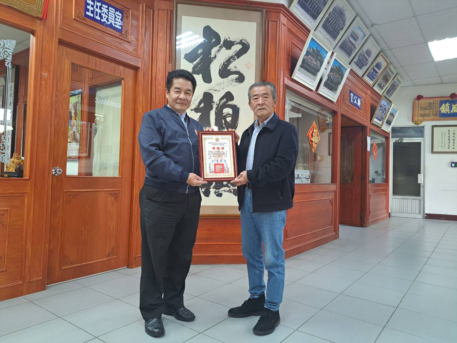 南投縣榮民服務處曹東發處長於日前偕同仁赴名間鄉「松柏嶺受天宮」贈送感謝狀,由受天宮常務審查委員陳嘉宏先生代表受贈,曹處長感謝「松柏嶺受天宮」認養名間鄉榮民遺孤,並請陳常務審查委員向主任委員陳登岳先生協助榮服處推動遺孤認養表示感謝之意。