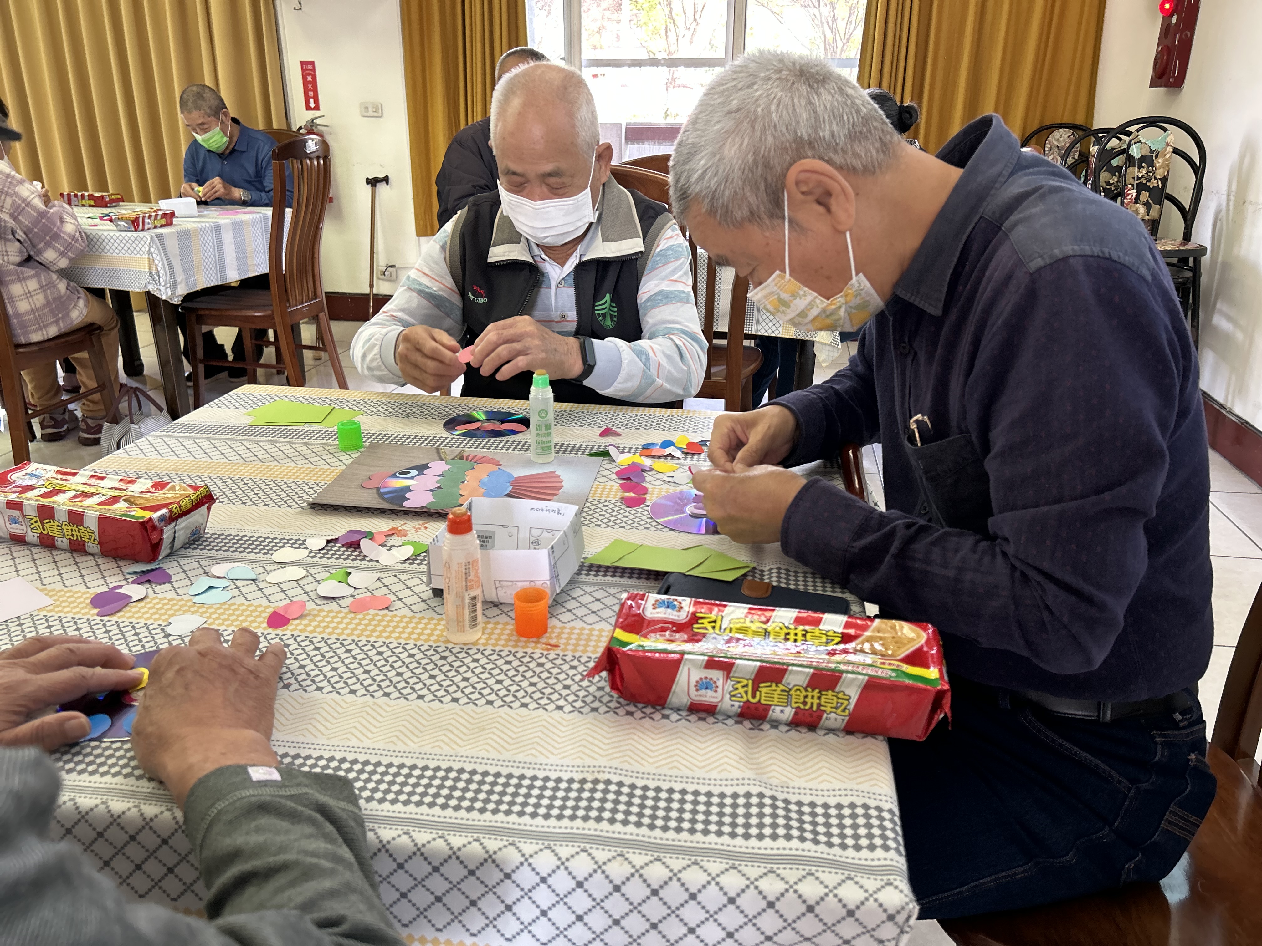 另為加深長輩的了解,同仁特提供家中廢光碟片,帶領長輩利用色紙剪愛心當魚鱗、以色紙相互對折成為魚鰭,最後貼上眼睛及紅色嘴巴,就完成既簡單又漂亮的五彩光碟魚吊飾,也傳達廢棄物回收再利用的概念!