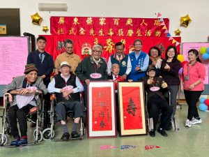 屏東榮家住民杜式全伯伯今屆逢百歲壽辰,屏東榮家精心布置忘我園區中庭舉行慶生活動,禮炮夾雜著鼓掌歡呼聲中,屏東榮家百歲人瑞伯伯胡賢明、佐子華、龔循亮相繼進場,期頤之年的伯伯們齊聚一堂,作為薪火相傳的象徵,跟隨其後的是屆百歲的伯伯:楊俊全、黃萬治、鮑民銀、江豐、邱永鑫。最後由家主任手牽今日的主角杜伯伯,穿越迎賓大道的氣球拱門,杜伯伯的妻子及女兒也親臨現場一同歡慶杜伯伯百歲生日。