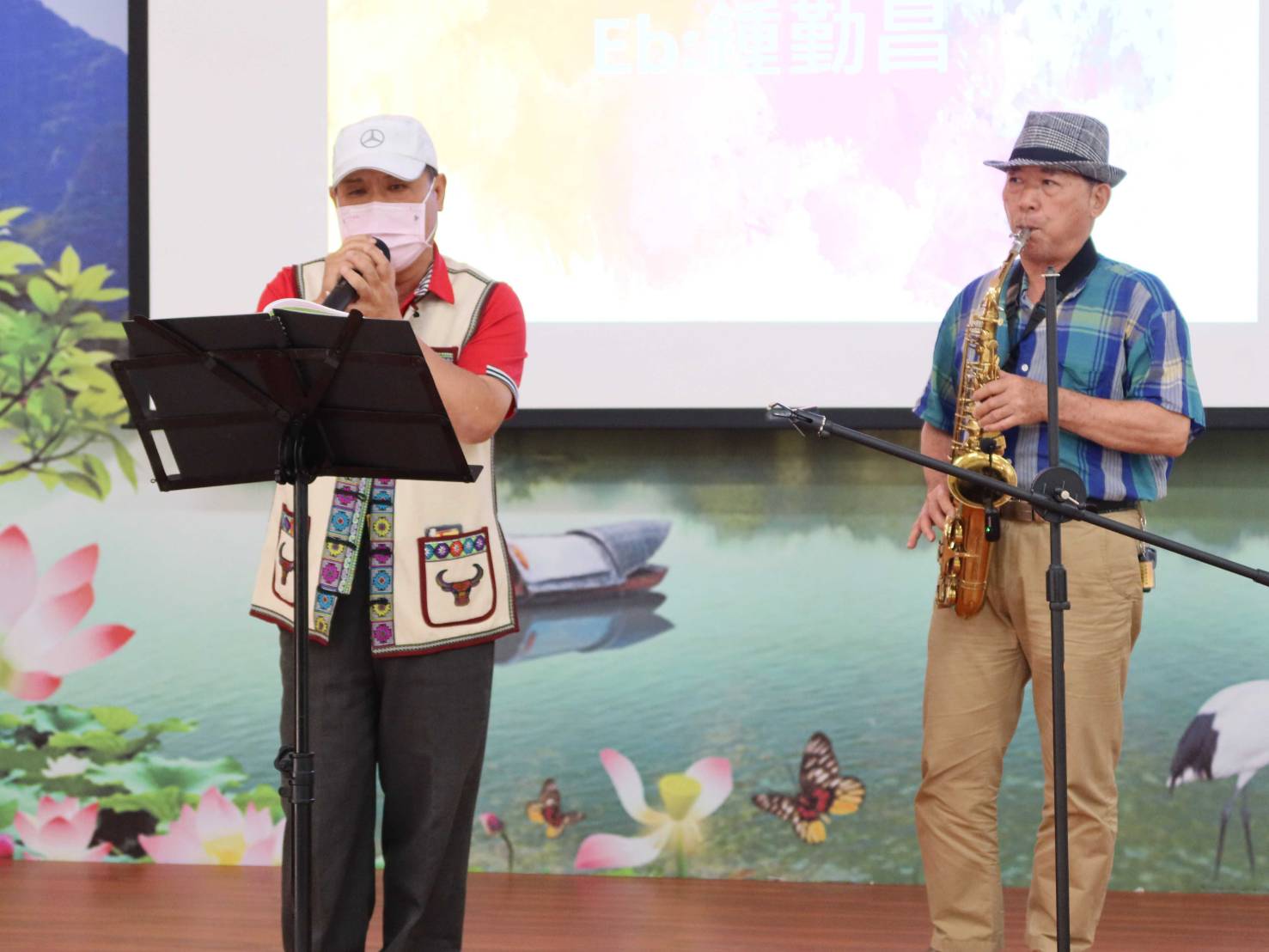 老師們連番演奏:愛江山更愛美人、望月想愛人,不同調性的薩克斯風演奏音色略有不同,也增添些許的浪漫氛圍。帶著感情的歌聲、搭配薩克斯風老師的精湛演奏,扣人心弦,台下長輩們忍不住高喊安可! 聽到熟悉的旋律,讓年近80歲的宮媽媽開心地上台手舞足蹈,喜愛音樂的心沒有年齡限制、樂手老師們真是魅力無限!