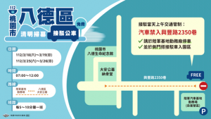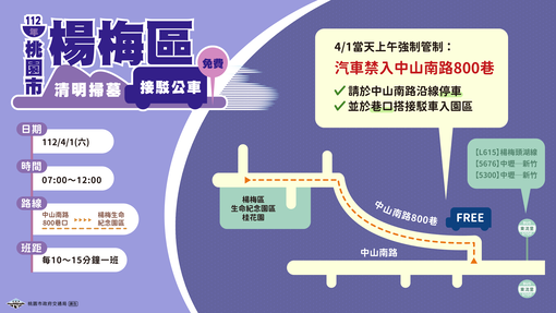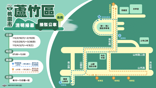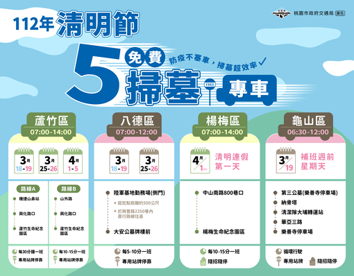 桃園市府為方便民眾祭祖掃墓,於蘆竹、八德、楊梅、龜山區提供清明掃墓接駁專車,免費接送民眾往返墓區,歡迎掃墓民眾多加利用。各公墓、納骨塔或生命紀念園區等地採取人潮分流及疏散對策,有三個星期的周末假日彈性運用,故配合區公所推出的掃墓專車,詳細路線行駛時間如下。