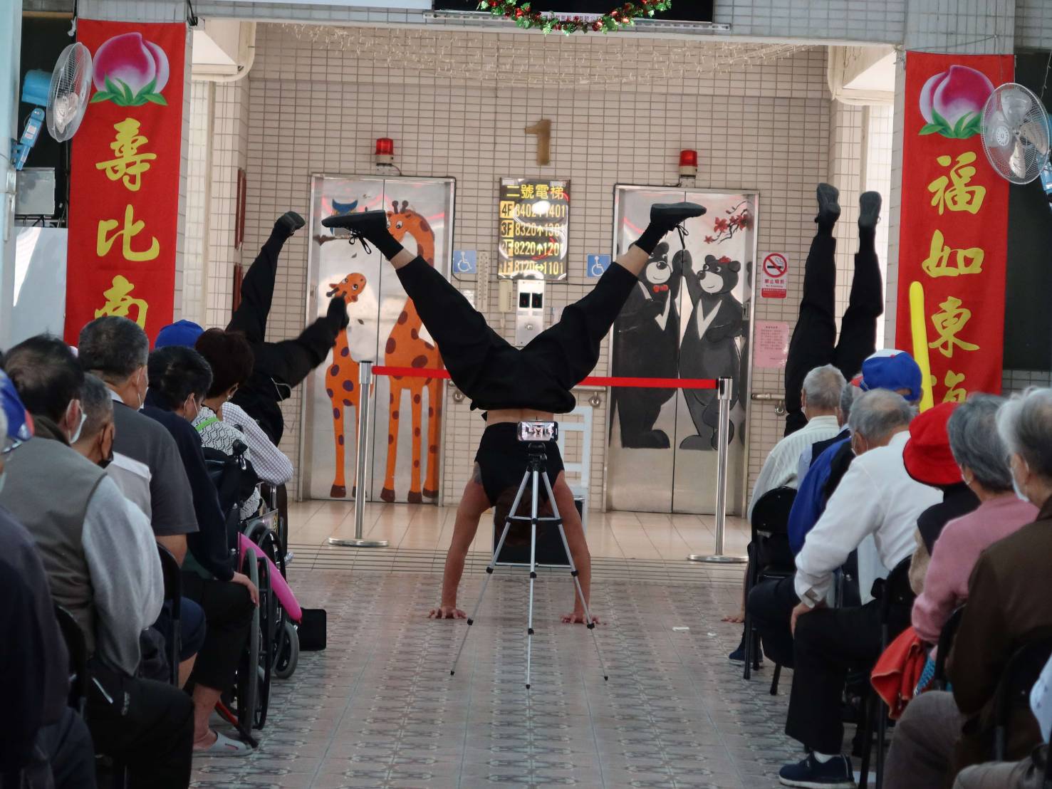 郭曉剛團長帶領江宥葳、林育廷等舞者蒞臨演出,表演過程沒有言語,全然透過肢體動作、表情,結合街舞、特技、馬戲等技巧,與台下爺爺奶奶們互動,並以強大的身體力量和高超的技巧呈現獨具風格的視覺饗宴,充分展現力與美。103歲邱爺爺坐在觀眾席第一排,看著舞者高超的特技及詼諧逗趣的表情與肢體動作,頻頻鼓掌叫好。