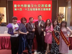 台中市歌藝文化交流協會昨(19)日假台中清水福宴婚宴會館舉行第十四、十五屆理事長交接典禮,在現場長官來賓及會員見證下,台中市議會副議長顏莉敏擔任監交人,第15屆總理事長郭顯榮自第14屆理事長廖俊隆手中接下印信。