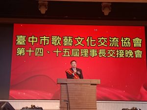 新任台中市歌藝文化交流協會第十五屆理事長郭顯榮表示,感謝廖俊隆前理事長為協會的辛苦付出,也感謝大家支持讓他有幸擔任協會第15屆理事長,這可說是任重道遠的任務,必將盡心盡力為會員們謀福利。