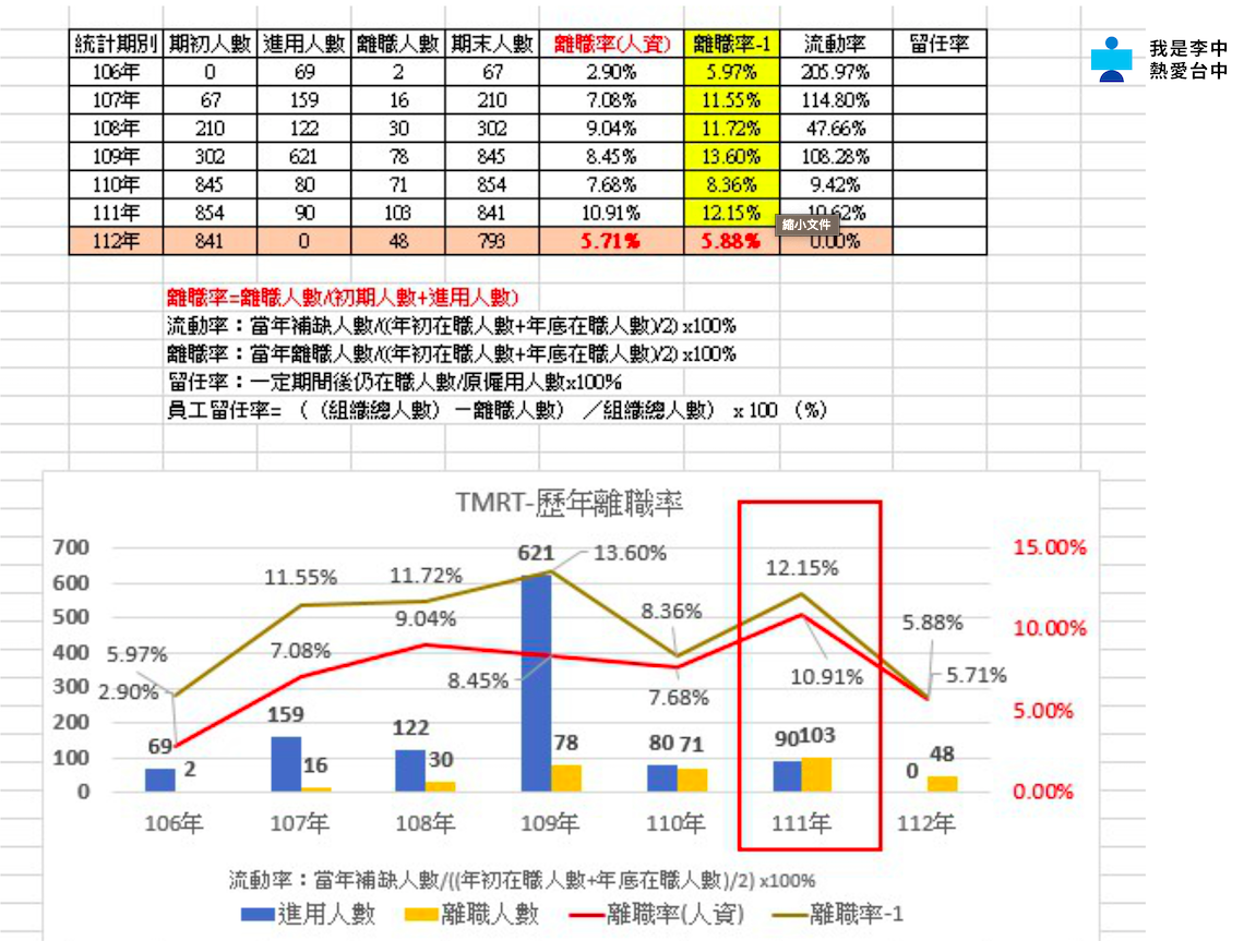 李中指出,臺中捷運公司自110年4月正式營運以來,高離職率的陰影持續籠罩,110年招募80位員工卻離職71位,111年招募90位卻離職103位。