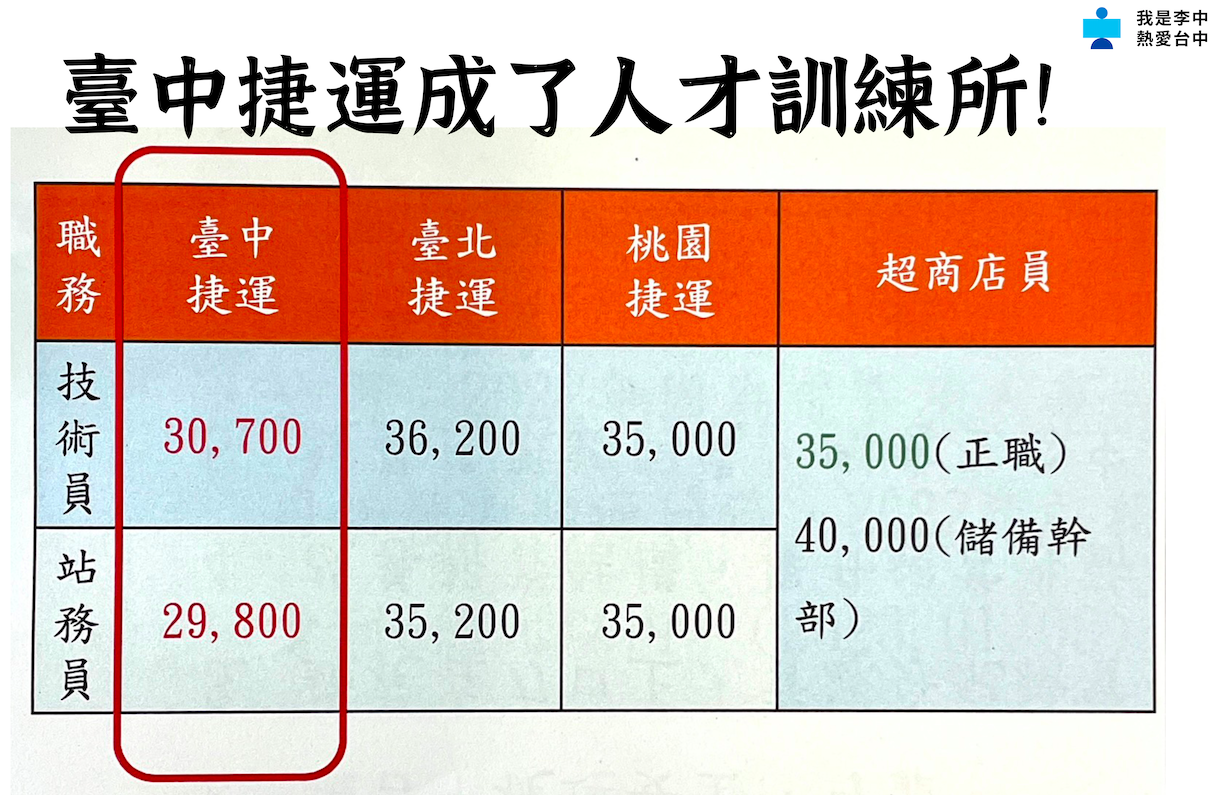 台中市議員李中今(20)日為中捷員工請命,盼中捷管理高層能重視基層薪資過低與人才流失的問題,儘速擬定調薪政策報府實施,別讓中捷淪為其他縣市捷運的人才訓練所。
