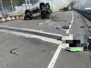 今(23)日上午9點,在台61線(西濱快速道路)北上112公里處、靠近苗栗白沙屯路段驚傳火燒車事故,一輛油罐車突然因不明原因翻覆,整輛車四輪朝天在路上,且車頭和車身分離,全面燃燒,十分驚心動魄,警消人員正趕往現場搶救,目前全線封閉中,詳細的案發經過,將有待警方進一步釐清。