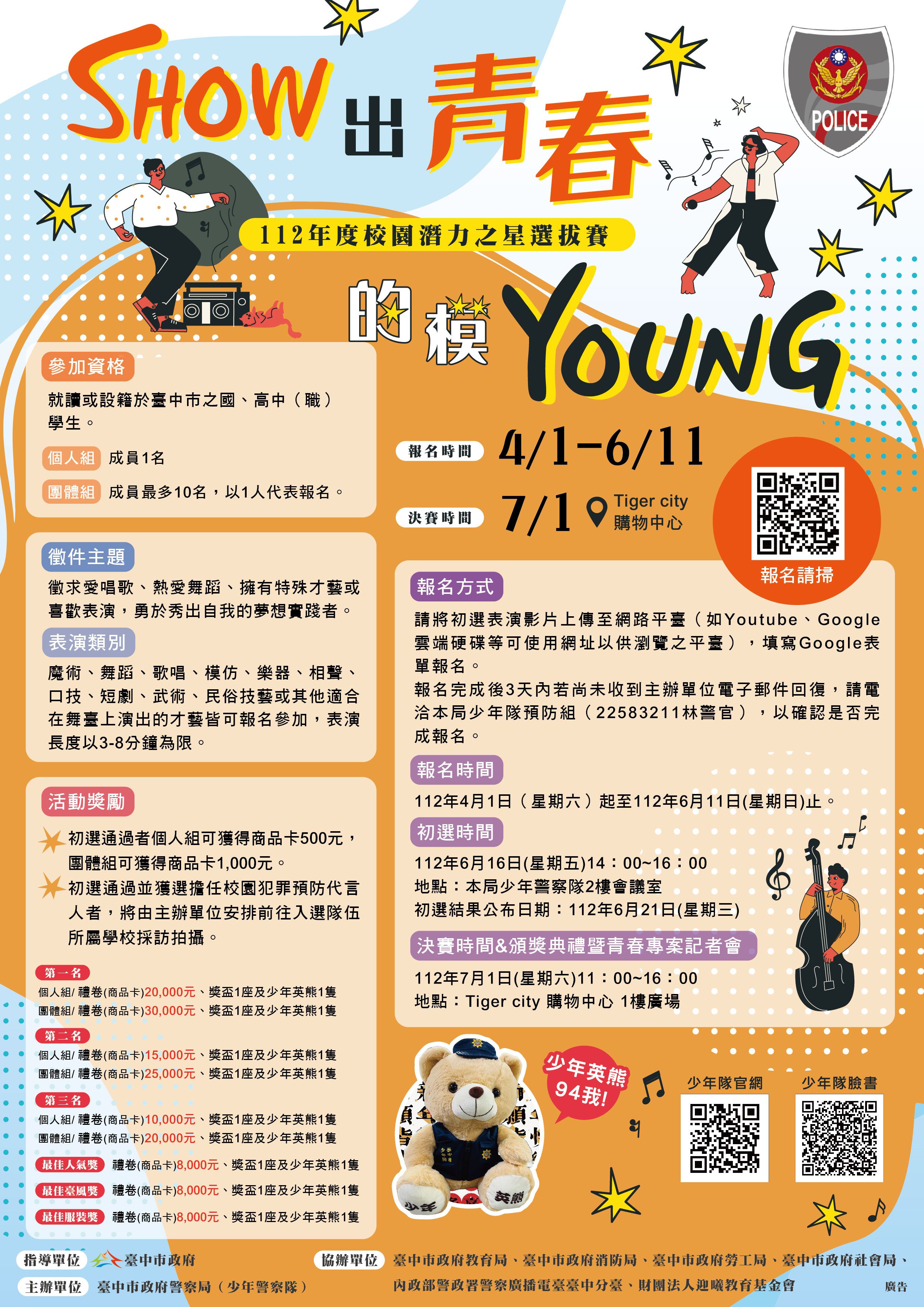 去年由臺中市警局舉辦的111年度校園潛力之星選拔賽~「Show出青春的模Young」,吸引許多位國、高中同學熱情參與,每位參賽者個個才華洋溢,獨具特色,獲得廣大市民與媒體一致好評,今年警察局再度舉辦徵選活動,徵選期間自112年4月1日起至6月11日止,只要是愛唱歌、愛跳舞、愛彈樂器、會武術、變魔術,擁有特殊才藝或喜歡表演,就讀或設籍於臺中市之國、高中(職)學生都可以報名。