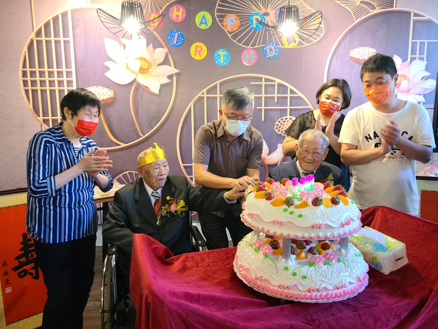 桃園榮家今(23)日於誠樸茶軒同時為林富錢、孫學義兩位長輩慶祝百歲壽辰,精心舉辦了一場溫馨熱鬧的生日會,現場準備了壽桃、壽麵、壽蛋及雙層大蛋糕,並由主任陳平代表總統蔡英文、行政院長蘇貞昌致贈祝壽壽屏及輔導會主任委員馮世寬準備的金壽桃項鍊,祝福兩位長輩福祿壽喜、身體健康。