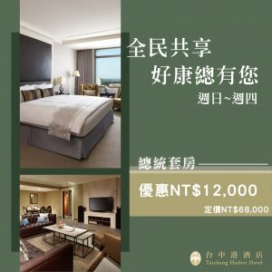 台中海線親子友善飯店-台中港酒店祭出優惠,凡於即日起~2023/05/31止,推出平日(週日-週四)每日限量一間入住總統套房,原訂價$68,000元現在只要$12,000元,雙人同行現在1 人僅需$6,000元,含翌日自助百匯早餐吃到飽。相當於最低折扣不用2折即可享受中部海線最頂級的套房,尊寵享受典雅寬敞的40坪舒適大空間,提供總裁貴賓級的頂級舒適享受 !!!
