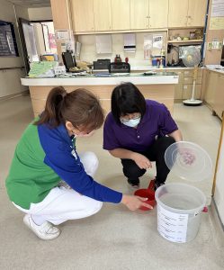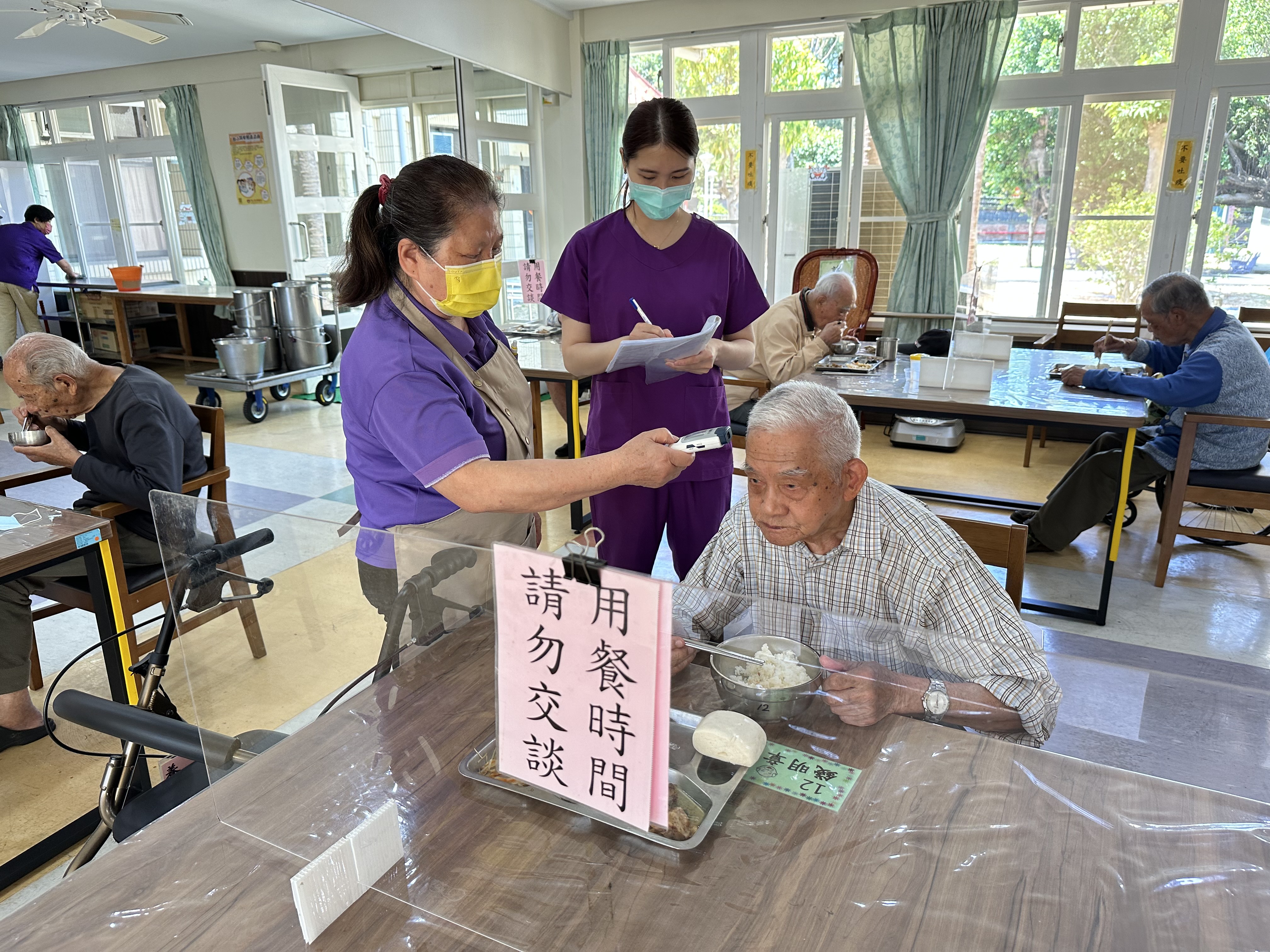 醫護人員巡視家區時和伯伯、阿姨寒暄問暖互動,順便抽問洗手步驟,伯伯、阿姨說保健組常常宣導洗手步驟也播放影片讓我們看,現在都會洗手口訣「內、外、夾、弓、大、立、腕」了,伯伯笑說:我真金不怕火煉,平時都有在做,不怕考試的啦!阿姨也很開心的說:入住榮家真的很幸福,有我們這群防疫小尖兵替榮家長輩得健康把關,服務周到,我們也很放心。
