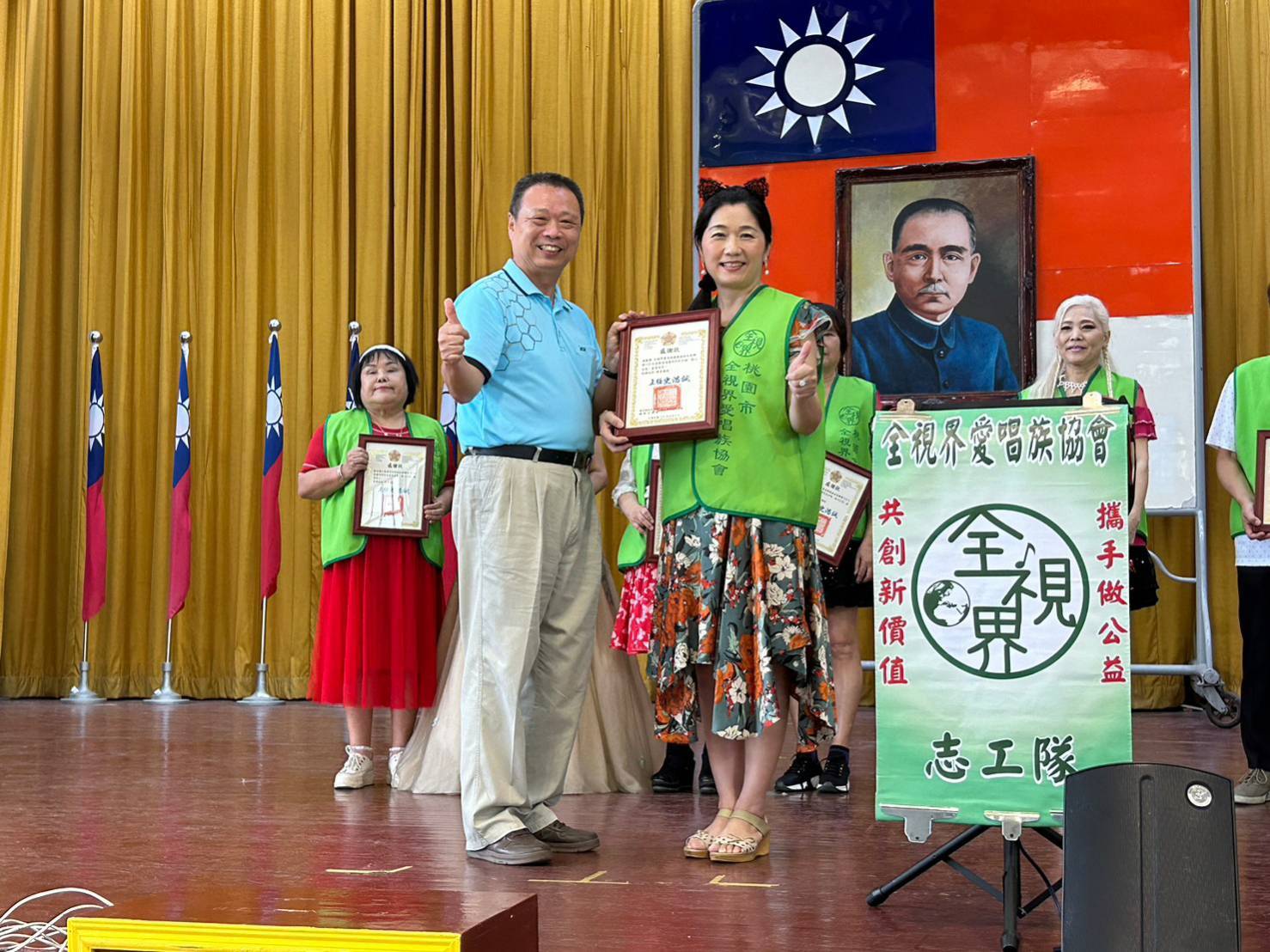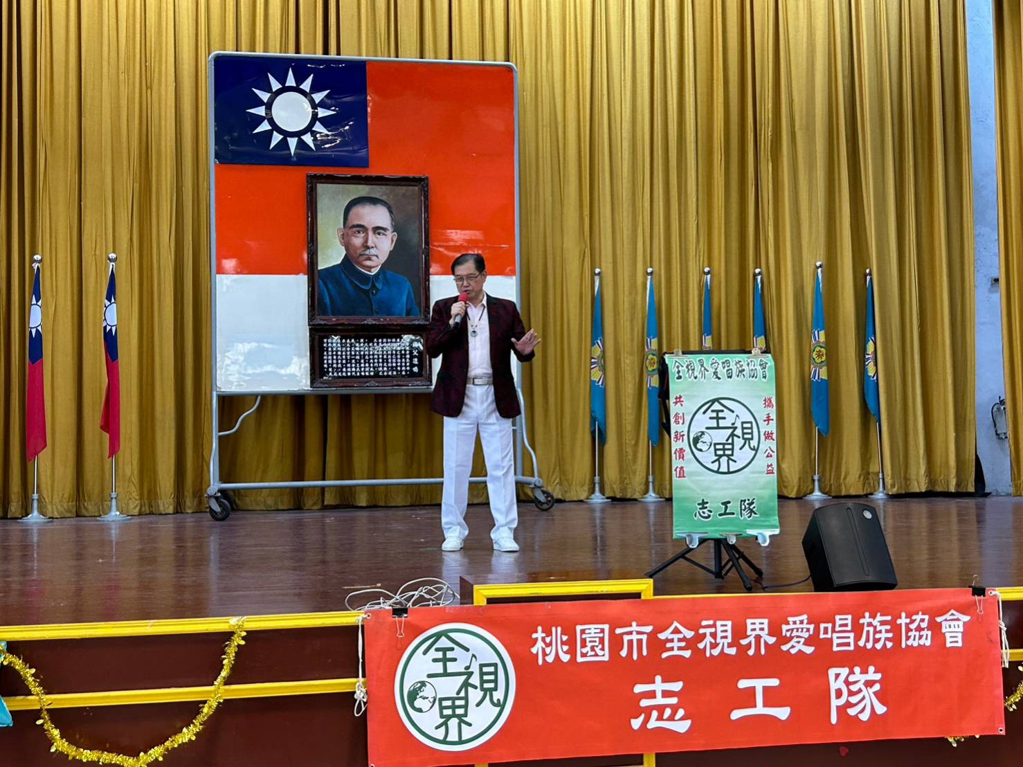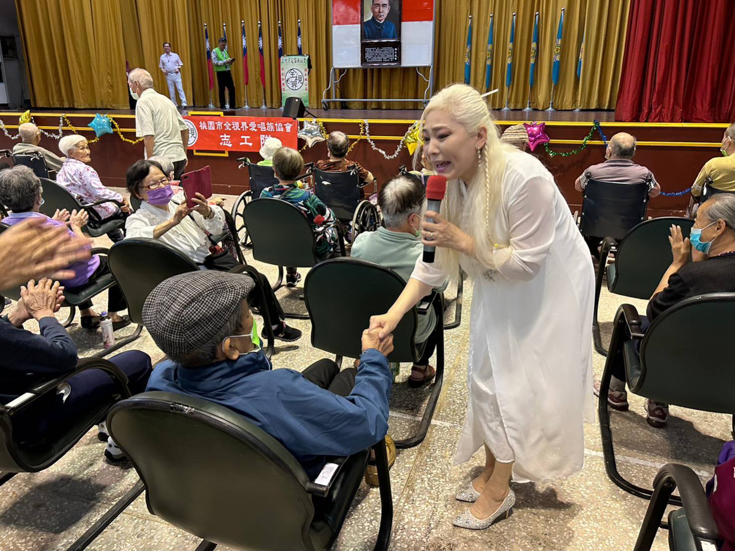 李志郎社工員表示,全視界愛唱族協會是桃園市正式立案的人民團體,理事長林紓玲及協會成員都是歌唱好手,常到各地義演,努力創造團隊價值;另鑑於團員多位是榮民子弟,今日特製別來到榮家,希望用歌聲將愛傳遞、以歌曲進行療癒,為社會盡份心力。