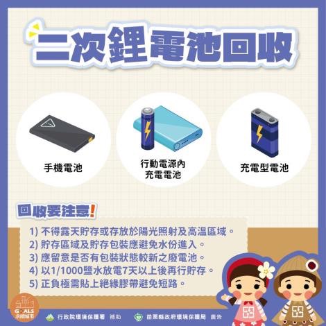 政府大力推動淨零轉型政策下,電動運具及儲能系統發展迅速,「二次鋰電池」可充電重複使用的鋰電池,廣泛的應用在手機、相機、筆記型電腦與平板電腦中。近年來,電動汽機車、自行車與大型儲能設備的動力,也高度仰賴鋰電池的供給。據環保署統計,111年「二次鋰電池」廢棄量為792公噸,預估到2025年,將成長為一年約1,100公噸。苗栗縣政府環保局局長陳華盛表示,目前全台廢乾電池回收站點統計已達20,000點以上,包含量販店、超級市場、連鎖便利商店、電信門市、清潔隊資源回收車及村里資收站⋯⋯等。