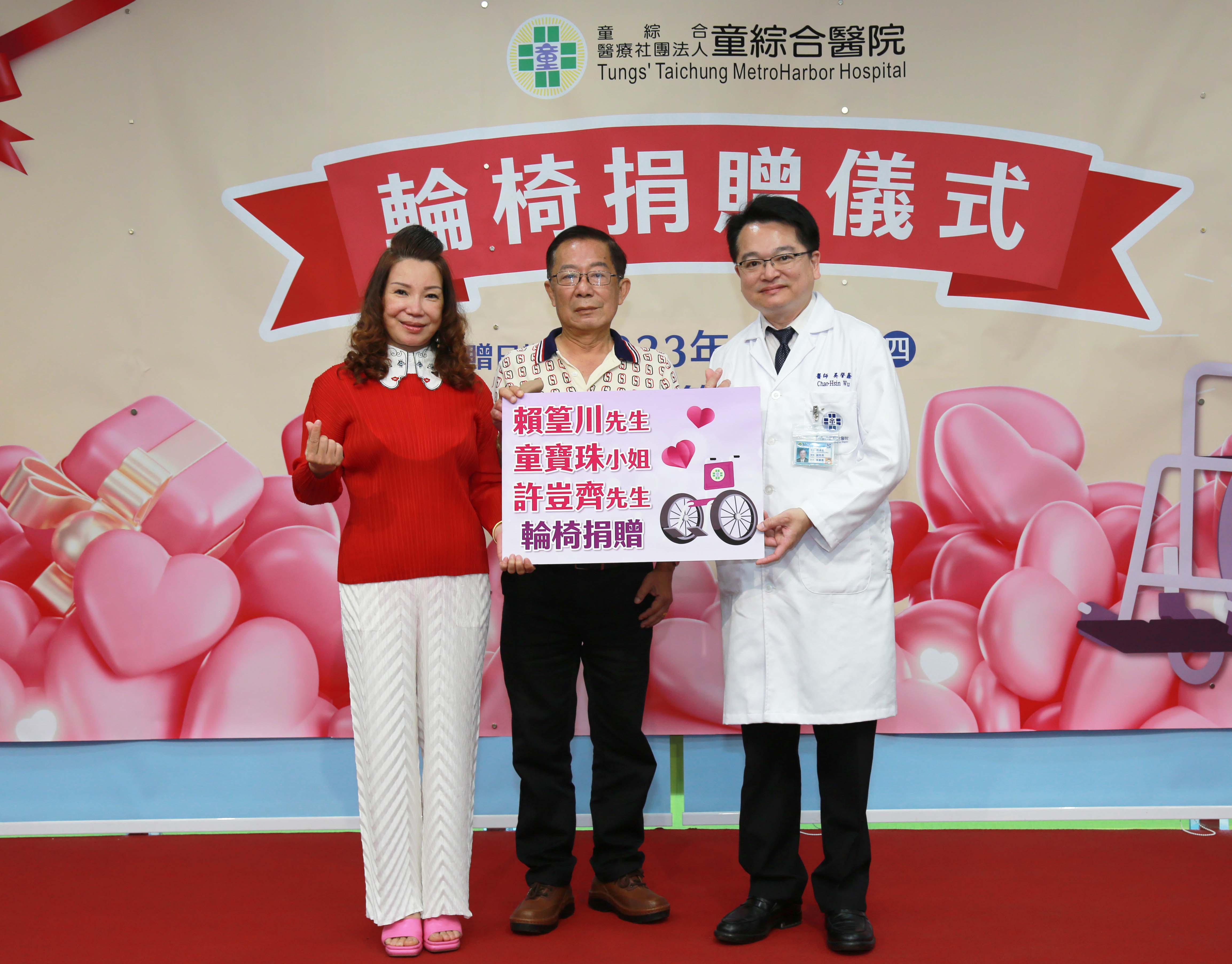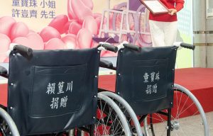 為提升行動不便及年老體弱者就醫行動的方便性,童寶珠小姐與家人賴篁川先生、許豈齊先生共同捐贈40台輪椅給予童綜合醫院,希望能藉此幫助到更多有需要的到院病人。