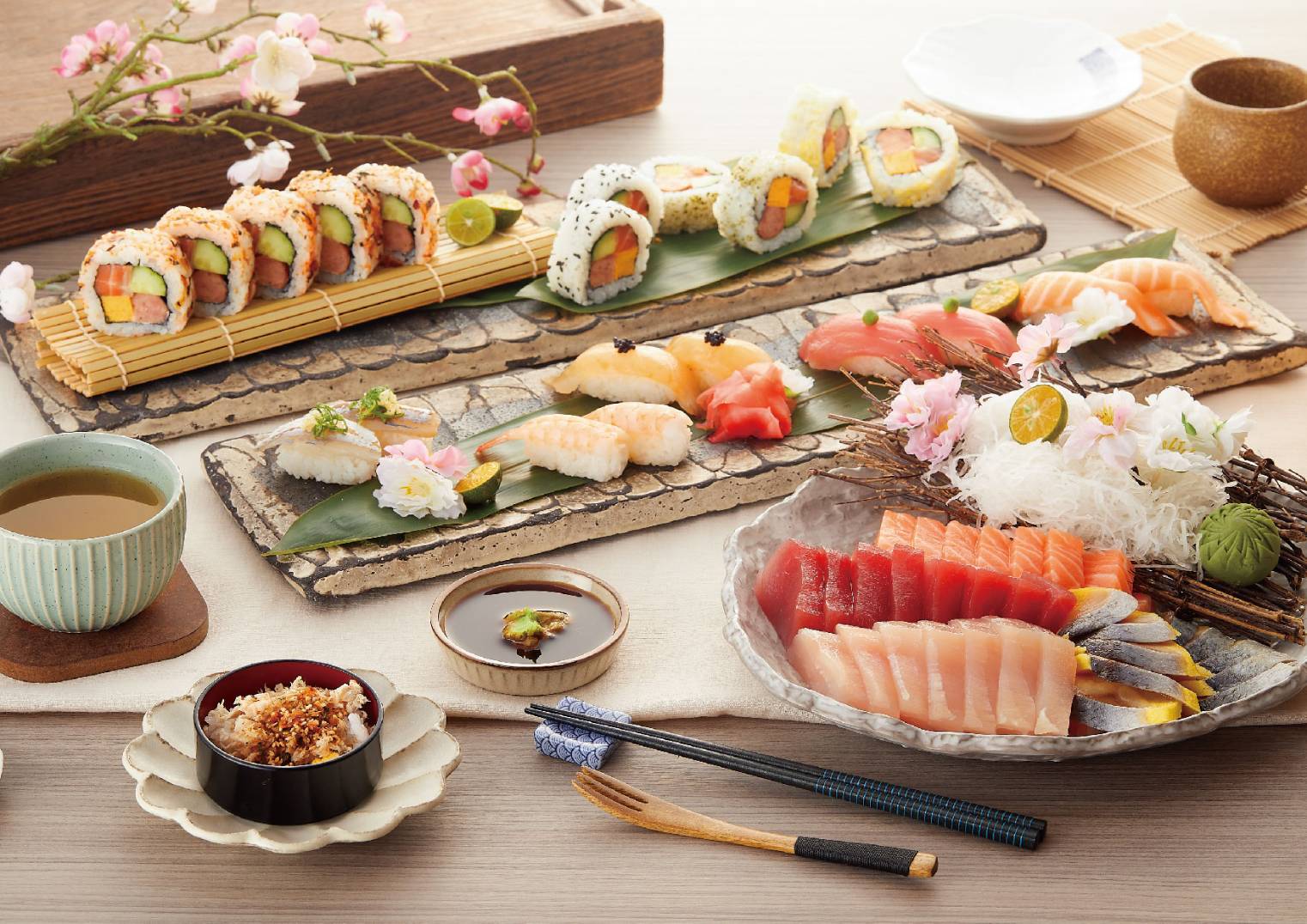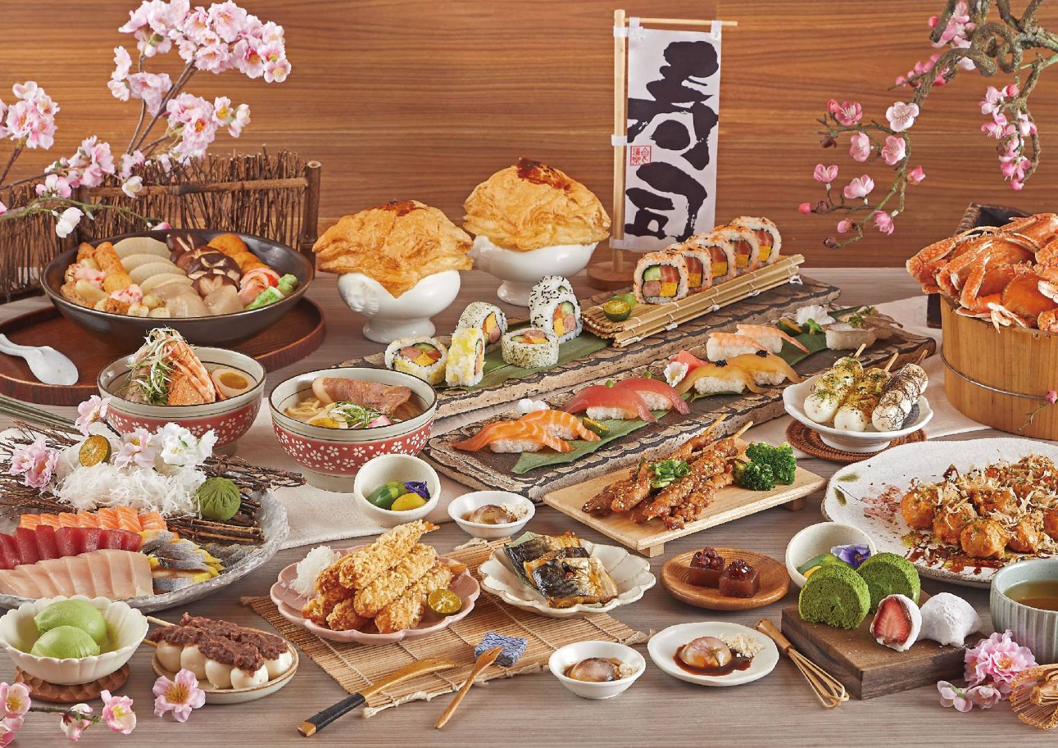 受到大小朋友喜愛的 [日式涼麵區] ,麵體有蕎麥、山藥、梅子、抹茶四種口味的選擇,佐上沁涼醬汁及多樣配料,是夏日裡的最佳消暑良伴。熱愛居酒屋的,還有醬燒雞肉串、鹽烤鯖魚、鹽烤生蠔、扇貝燒、蒲燒鰻魚飯、鮭魚茶泡飯、日式烤糰子…..等,配上一杯冰啤酒,彷彿瞬間來到夜晚東京街頭 ! 飯後甜點則有日式紅豆羊羹、京都栗子羊羹、紅豆大福、抹茶生乳捲及晶瑩剔透的日式櫻花水信玄餅…等,滿足每位顧客的少女心。