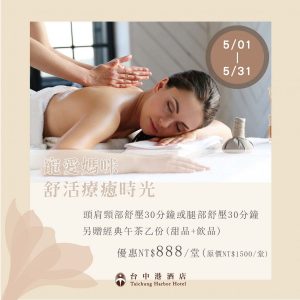 讓媽媽釋放壓力之餘,享受身心靈全然綻放。誠摯邀請民眾蒞臨台中港酒店共度愉快佳節,創造難忘的溫馨美好回憶! 預約專線(04)-2656-8888 。