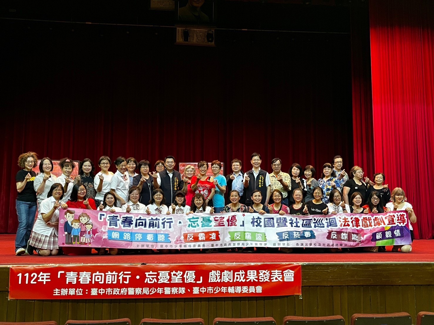 今年度戲劇宣導「青春向前行˙忘憂望優」,以「青少年家庭關係」、「網路交友」、「竊盜」、「毒品」及「詐欺」等議題為主,自112年3月份每周六、日由大開劇團老師進行戲劇基礎、進階訓練、肢體及口語表達及演出技巧等,累計投入131人次,604小時,過程中風雨無阻、排除困難與挫折完成訓練,其奉獻及付出精神著實令人感佩。