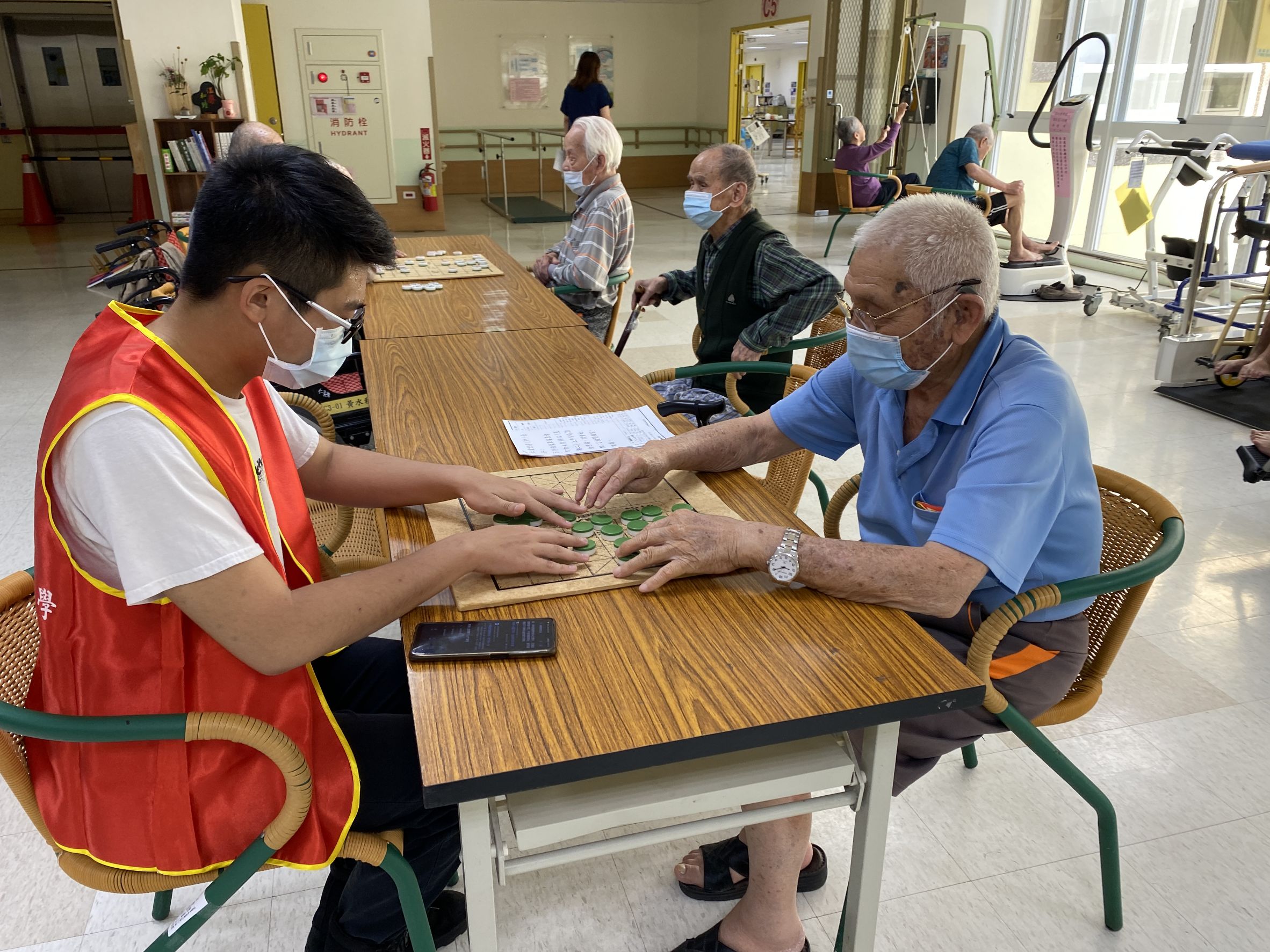 林同學每周三天從學校騎三公里多的腳踏車來榮家,服務內容包括陪長輩玩平板遊戲、糾團玩Switch、下象棋、輪椅推送住民參加大型表演活動、中午慶生餐會時幫忙夾菜桌邊服務等。學習最後一天安排對長輩們發表心得,他說「這裡的老人家人都很好,原本還有點擔心不知道怎麼跟老人互動,發現找他們玩遊戲、下棋都不會拒絕,還會一起玩,在雲林榮家的服務學習真的很快樂也更了解了老人的需求,感覺才剛開始一下子12小時就過了,很感謝雲林榮家讓他獲得一次難得的服務體驗。」短短一分多鐘的心得分享,獲得了台下爺奶們的熱烈掌聲,受歡迎的程度連工作人員都要忌妒了,林同學開心的說有空會找同學再來當志工,一起玩遊戲。