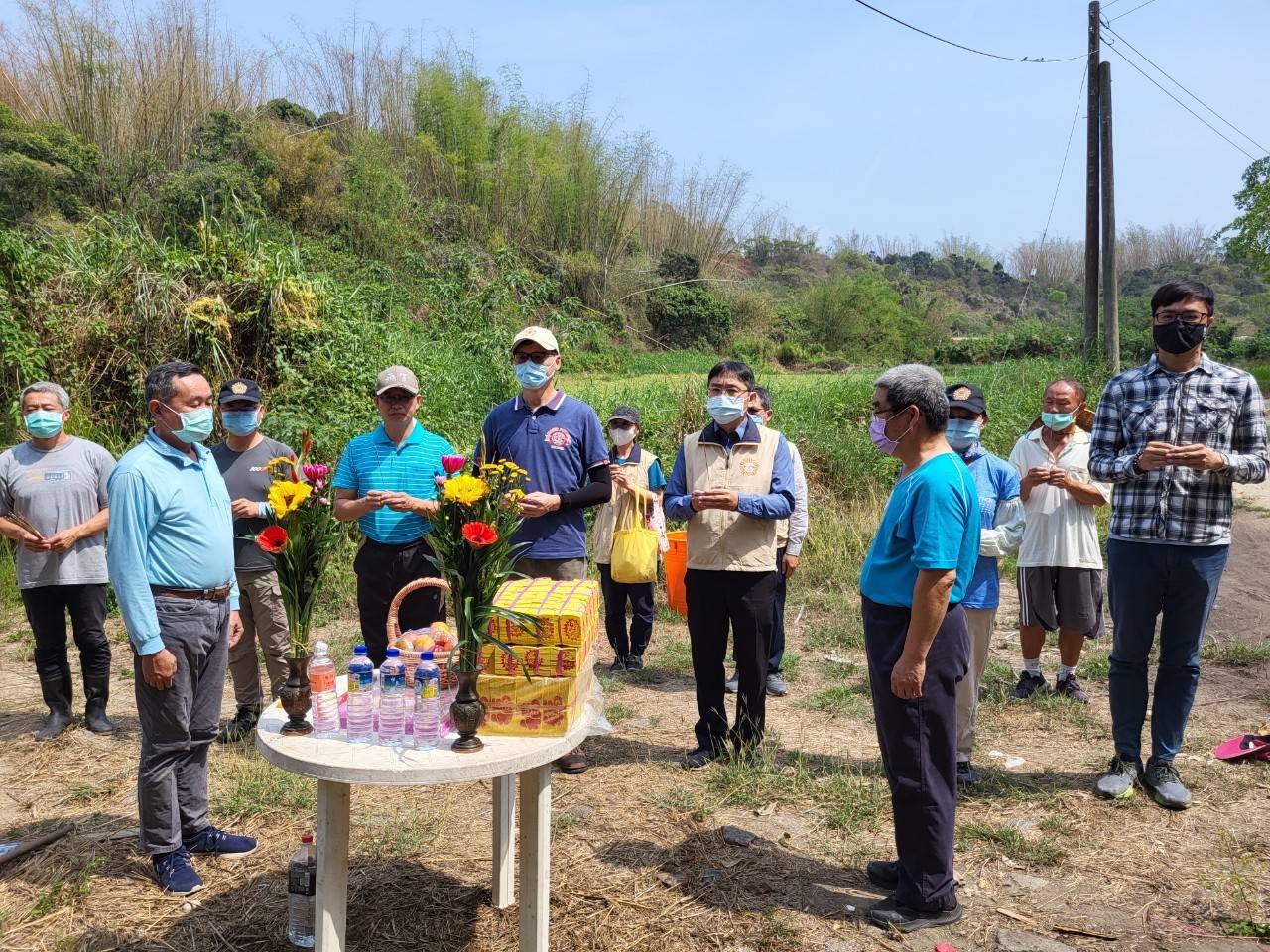 整理前,於現場慎重地擺設鮮花、素果、三牲等祭品,由岡山榮家詹光宇主任帶領同仁們祭拜亡故榮靈,虔誠說明榮家與榮服處同仁主動熱心之情,隨後義務服務的同仁們挽起衣袖,拿著鋸子、鋤頭、鐮刀,按分配區域開始清理。
