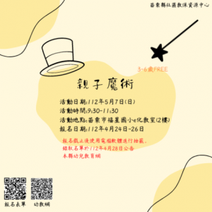 苗栗縣社區教保資源中心自108學年度成立至今,為提升家長與幼兒的互動及學習,增進家庭共學知能,累計已辦理數十場親子活動。112年度親子魔術活動,將於5月7日登場!特別邀請吳俊輝講師介紹透過親子同樂的魔術活動,引發親子高度動機與興趣,共同探索使用的魔術道具及其背後所含的科學原理,體驗科學與魔術。
