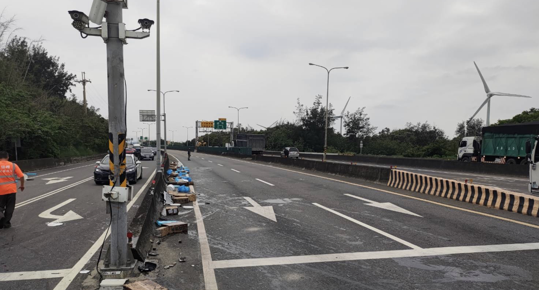 經查事發時,路口號誌為臺61線側車道左轉箭頭綠燈,大貨車在南下側車道向左轉,與南下快(主)車道闖紅燈直行曳引車發生碰撞。雙方均無酒駕情事,事故現場大面積的散落物與油漬,聯絡苗栗工務段到場清理;為防止二次事故的發生,員警利用巡邏車、交通錐等,並於該段防撞車於事故上游端警示,以利疏導行經車輛,確保用路安全及防止車流回堵情事。肇事原因待警方後續調查釐清,相關違情均將依規辦理。