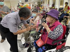 活動過程簡單隆重而溫馨,不僅備有慶祝蛋糕讓參加住民享用,活動現場播放了多首慶祝母親節的歌曲,包括天下媽媽都是一樣的、媽媽寶貝等溫馨曲目,讓現場氛圍更加和諧。榮家主任蘇再勝帶領榮家幹部至各堂隊,親手將象徵母愛的康乃馨獻予榮家120餘位女性住民,代表榮家向她們致上最高的敬意與祝福,讓女性住民們感受到家庭的溫暖與關懷,同時也喚起大家對家中女性的感恩之心。