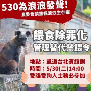 本次的主題在於“餵食“,台灣餵食浪浪的愛心人士非常多,政府擔心因餵食造成環境污染及犬隻聚集;5月9日陳吉仲主委在會議中,說詞模糊,提到禁止餵食的九個示範區,若效果彰顯,將逐步擴展至2176個村里,將近台灣1/3的村里,導致民眾的恐慌。其實,可透過輔導愛媽,舉例:新北動保處每季舉辦講習,並發放餵養餐具,參與者取得志工證、餵養照護證,需每年換證,新北動保處的做法雖仍有提升空間,但這是與餵食者做正面的溝通與訓練,是往好的方向在努力。目前本人所換觸餵食者的觀念都比動保處更進步,也都知道要TNVR。