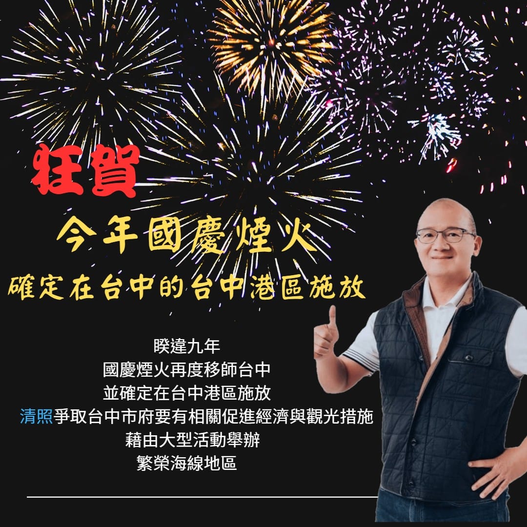 議長張清照今天要跟鄉親報告一個好消息,睽違9年的國慶煙火,112年國慶焰火將在台中港區盛大登場。