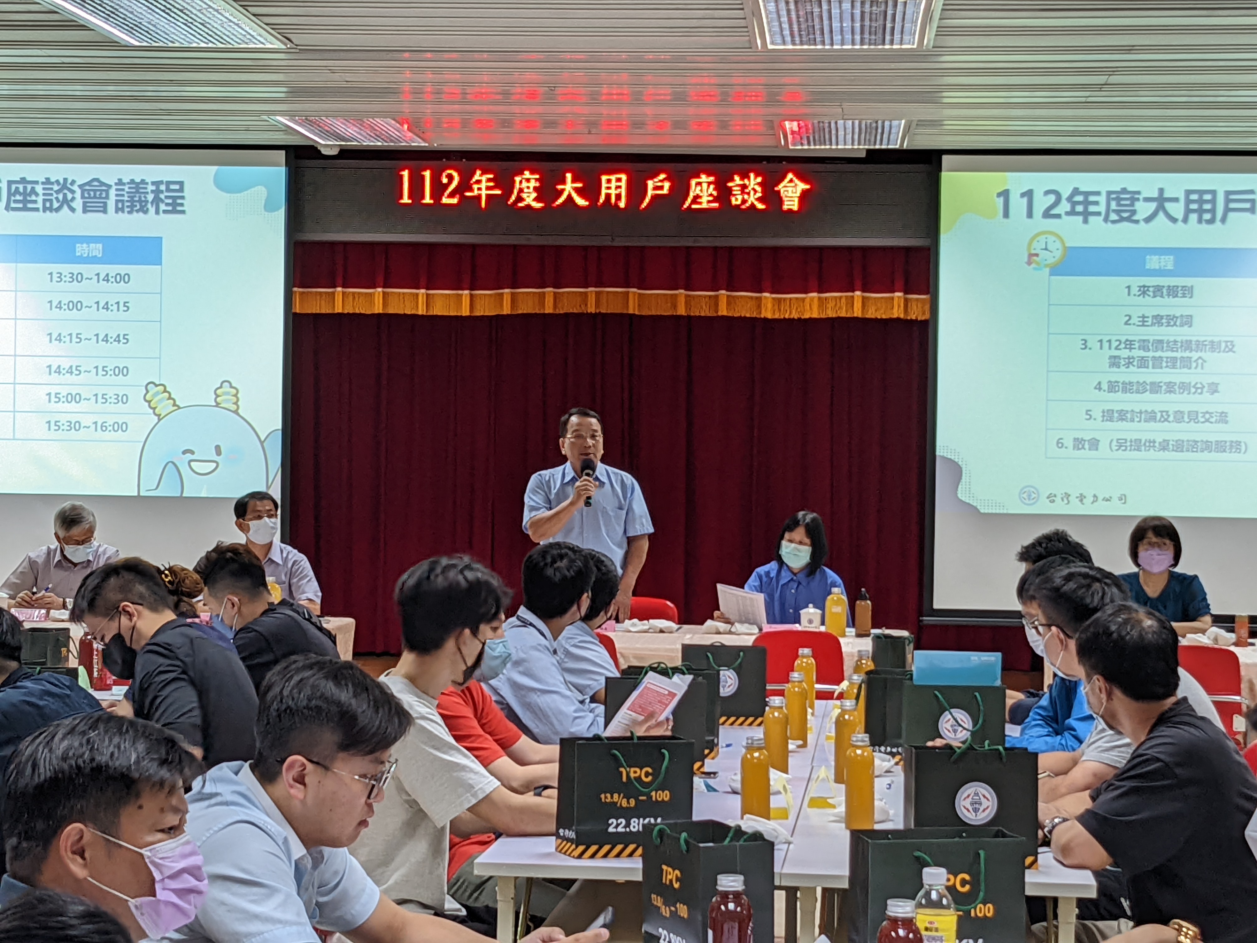 台電台中區處今(12 )日下午於自由路二段的台電台中區營業處大樓,召開大台中地區之「112年度第二次用電大戶座談會」,此次座談會針對「非生產性質用電大戶」召開,其中主要有餐飲業、旅館業、百貨業、及大型辦公大廈等,其「空調用電佔比高」之近百位用電大戶與會;座談會中,台電除介紹今(112)年1月1日正式上路的「新尖、離峰時間電價」,更特別針對來參與座談會的「空調用電佔整體用電比率高」之用戶用電特性,分析了主要大型空調用電設備的運作原理,進而提出各項建議方案,使空調用電大戶能夠將空調設備「運轉用電量大的時間移轉至離峰用電時間」,減少尖峰用電時間的用電量,進而大幅減少用電支出!參與座談會之用戶表示,台電針對不同用電特性用戶提出不同的節電方案,確實能夠大大降低用電大戶們在面對夏季電費增加的壓力!