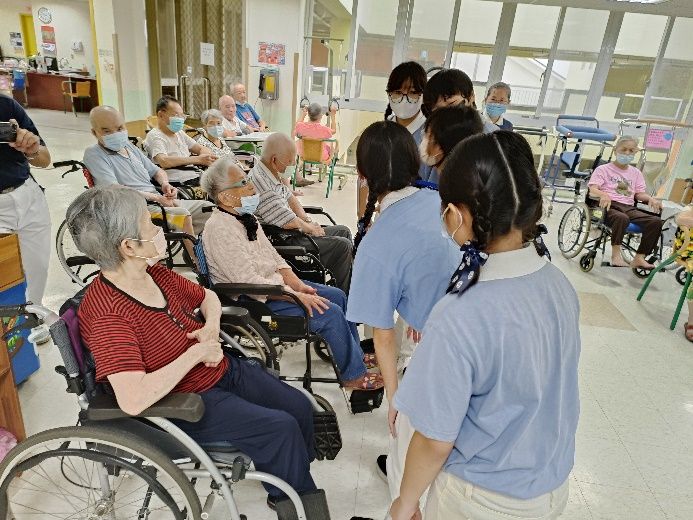 青少年志工們到達榮家後,邀請住民長輩們到活動場地參加活動,住民們看到年輕志工們熱情的邀約,都踴躍地參加活動。活動一開始由兩位青年志工主持活動開場,看到他們穩健大氣的台風,住民們也用熱烈的掌聲給予回應,接著帶來手語舞蹈活絡現場氣氛,藉由「請你跟我這樣做」的活動,志工們在長輩前方跟著主持人的口令,陪伴長輩進行肢體運動,透過捏饅頭遊戲幫長輩按摩,陪伴住民長輩聊天,強化青少年與長輩的互動,讓住民們感受到滿滿的青春活力,也感覺到自己年輕了許多。