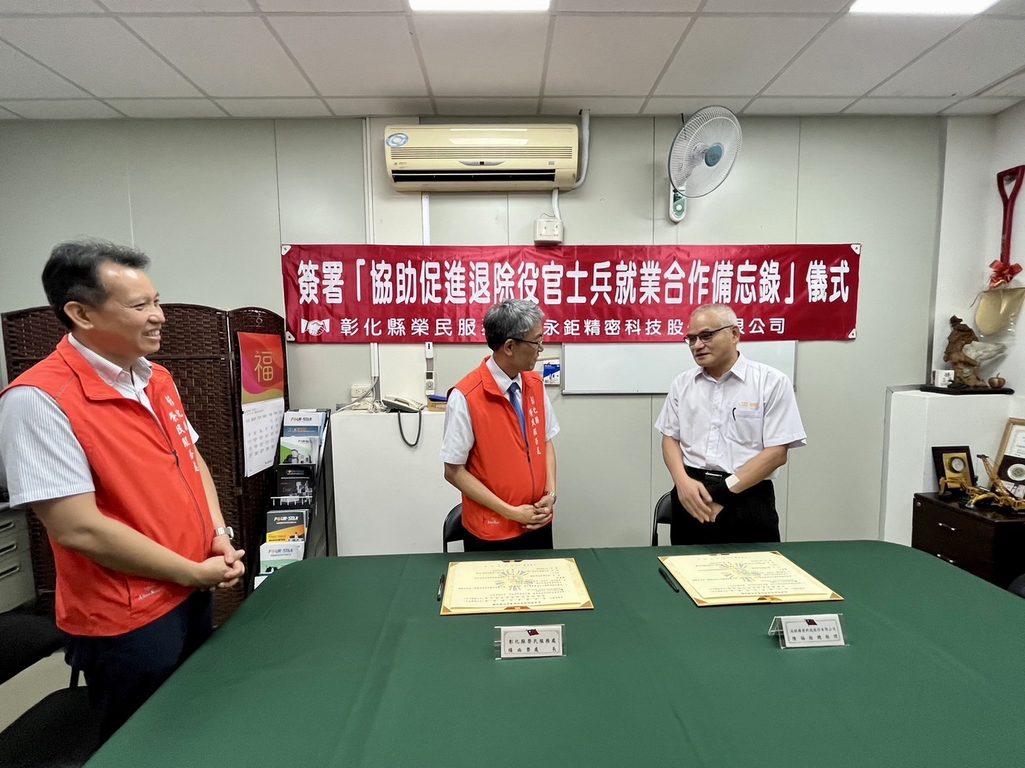 彰化縣榮民服務處為拓展退除役官兵就業管道,於今(15)日由楊雨榮處長與永鉅精密科技股份有限公司陳福栓總經理簽署「促進退除役官兵就業合作備忘錄」,建立互惠合作管道共同攜手合作,協助有就業需求的退除役官兵順利進入職場穩定就業。期透過與企業鍊結,為退除役官兵及眷屬創造更多元的資源與效益。