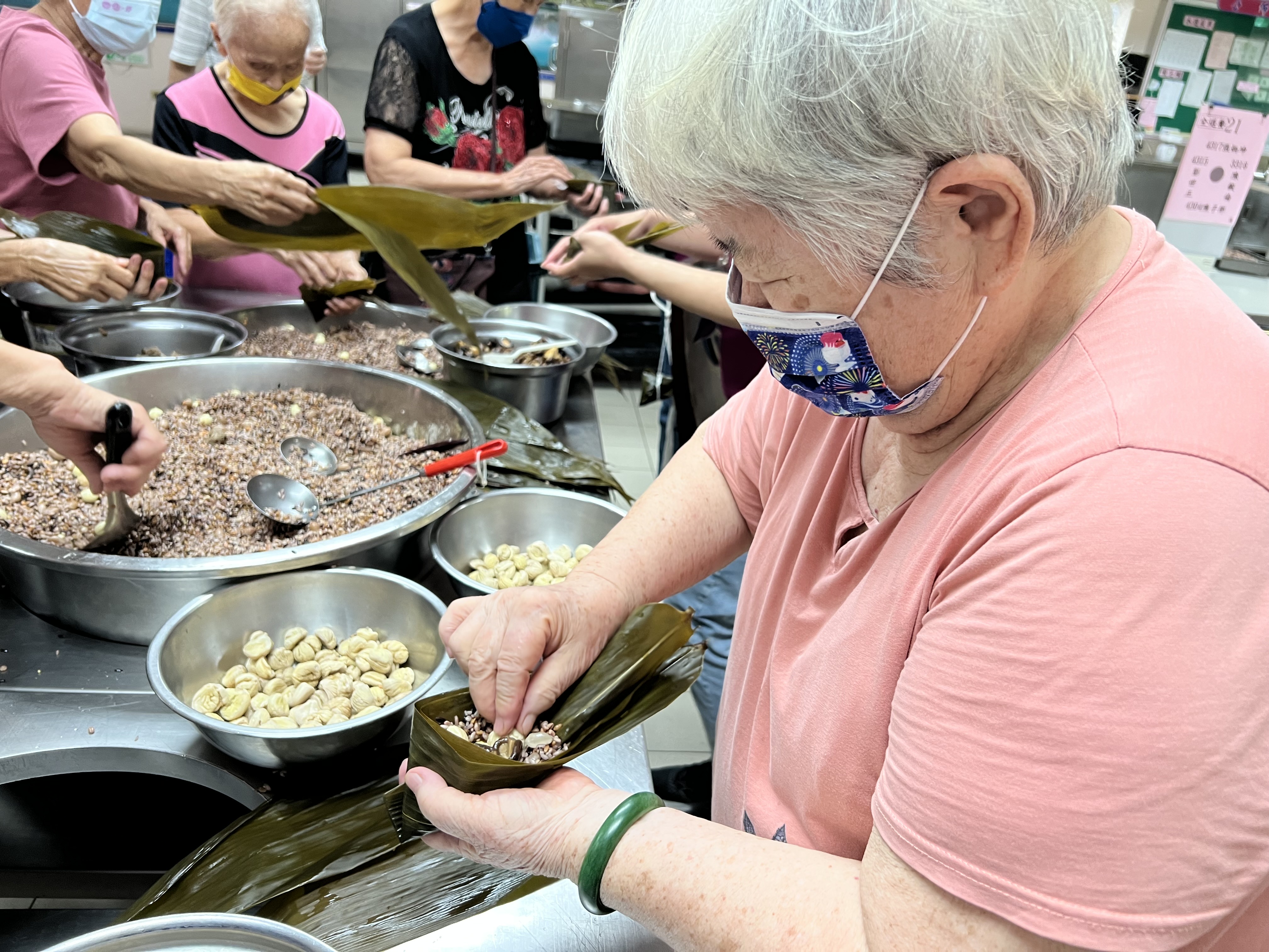 郭豫臨主任一早領著住民長輩、活力志工們洗粽葉、淘米、切菇、去皮…,一群人忙裡忙外、好不熱鬧,彷彿回到以往眷村時光,在端午節慶前總可以看到家家戶戶在門口炊煙裊裊、粽香四溢,一邊聊著生活趣事,一邊著手準備美味可口的粽子。看到每位阿姨熟練的將兩片粽葉交叉,放進糯米壓緊,又再把香菇、栗子及蛋黃等食材鋪上,然後再次放進糯米壓實,綁上繩子,一串串香噴噴的粽子就團結一致的掛著,整個餐廳都洋溢著家庭般的溫馨氛圍。