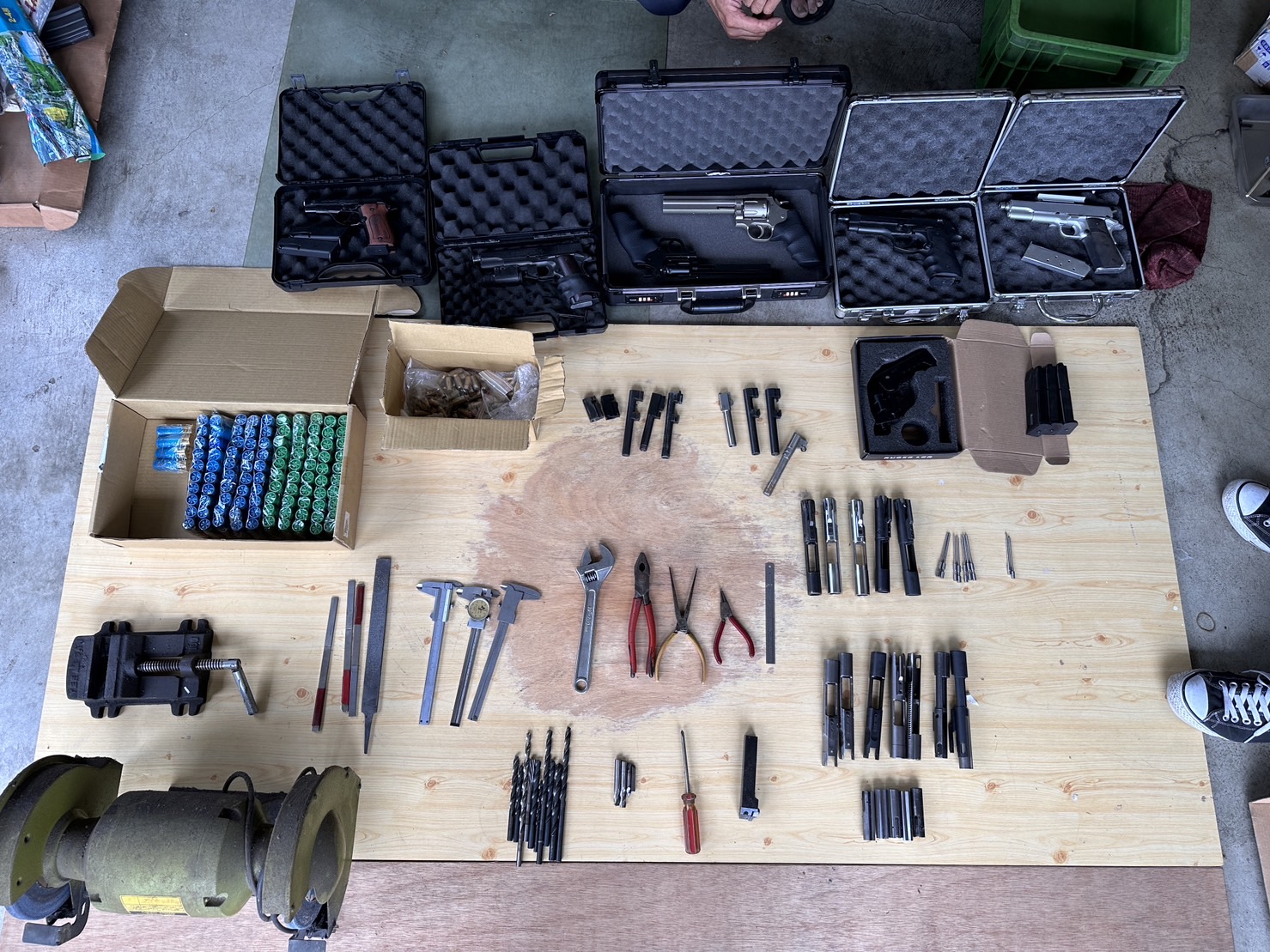 少年隊員警接獲線報得知,黃嫌亟欲與買家當面展示個人「研究成果」以販售槍枝,隨即與刑大偵三隊聯合彰化縣警察局和美分局員警前往查緝,當場查獲(扣)結構完整具殺傷力改造手槍成品7枝、手槍子彈55顆、霰彈槍子彈104顆、半成品改造槍管7支、半成品槍身部件16件、改造工具一批(含大型洗床1部、大型車床1部、電動砂輪機1臺及其他鐵工用具)等證物。