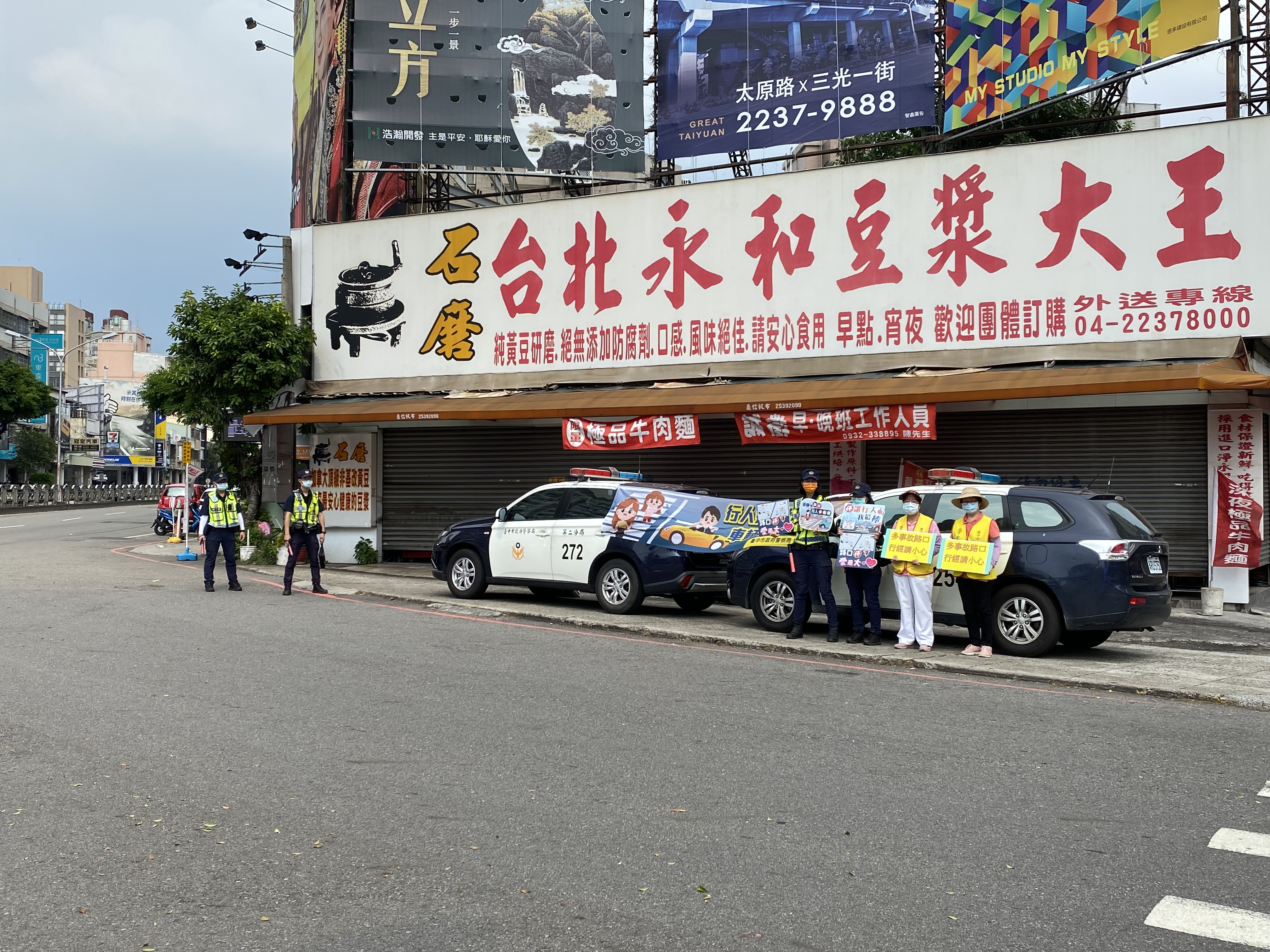 中市警二分局取締車輛未停讓行人過程中,也同步將巡邏車掛上『車輛路口不停讓 行人取締大執法』等布條,運用志工、義交等民力,採取宣導並進方式,針對轄內易肇事地點及時段,編排守望勤務加強取締及宣導,多措並舉,灌輸汽機車駕駛正確通行觀念。