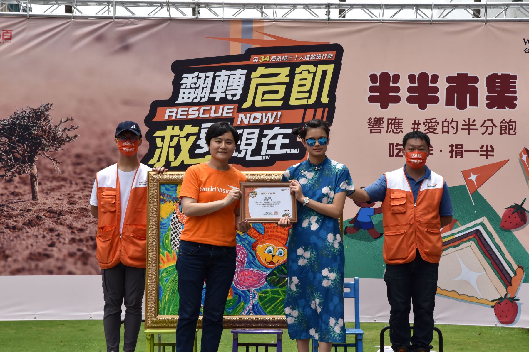 今日活動上還有一位特別嘉賓,熱心公益的畫家陳曦,自3歲開始學畫,已經辦過十多場個展,畫作更是被許多國內外收藏家典藏,而陳曦不單單只是一位出色的畫家,更一位熱心公益的女孩,今天(7/9)贈送一幅畫作予台灣世界展望會,用具體行動支持全球脆弱兒童遠離飢餓。陳曦表示:「亞馬遜雨林佔世界雨林面積的一半,森林面積的21%,是全球最大及物種最多的熱帶雨林。但因為氣候變遷,亞馬遜雨林有可能在公元2100年前消失。全球近半數兒童居住在氣候極端高度風險的國家中,極度缺乏基本設施,當天災變多、自然資源變少,孩子更容易落入家暴、失學、童工、童婚、甚至營養不良,無法好好長大的困境。這次所捐贈的畫想表達的是,我們生活在同一個星球上,沒有人是旁觀者,雨林應該是充滿生氣的動物樂園,兒童應該生活在安全受保護、可以平安成長的環境。希望透過畫作傳遞翻轉危機救要現在的信念,邀請大家一起來關心氣候變遷、氣候難民。」